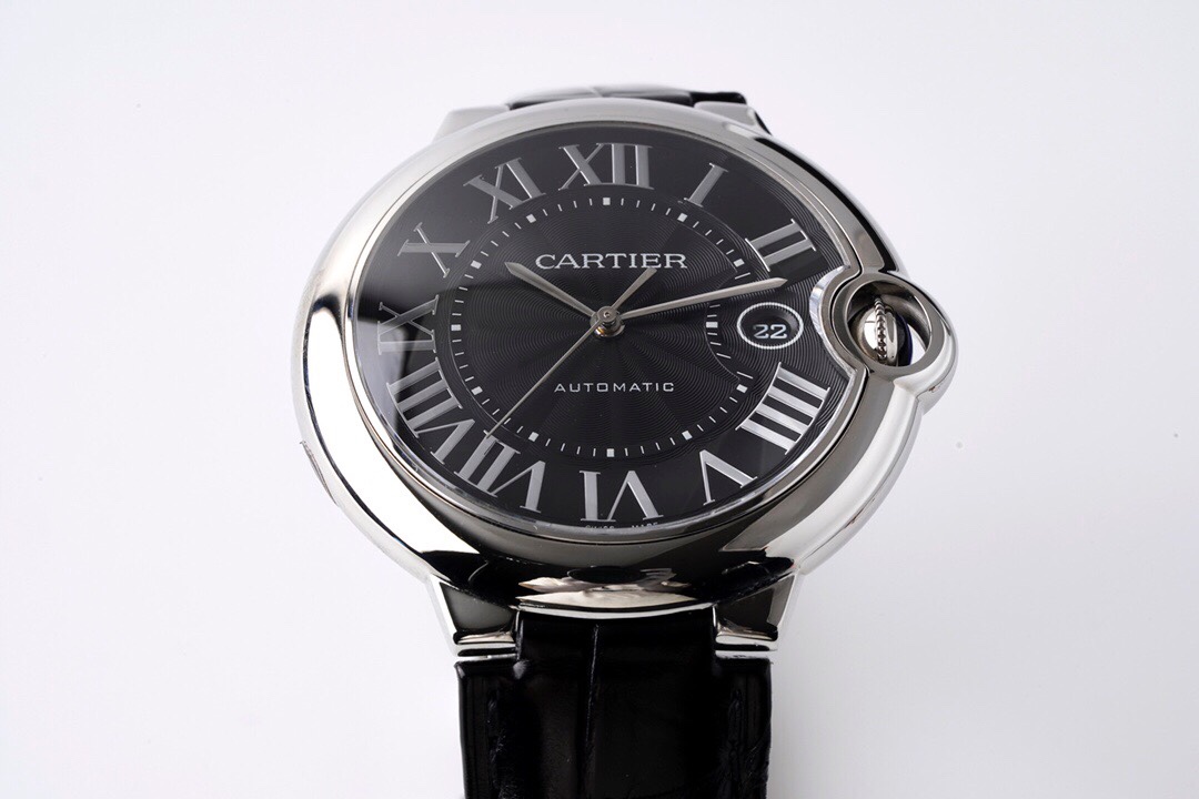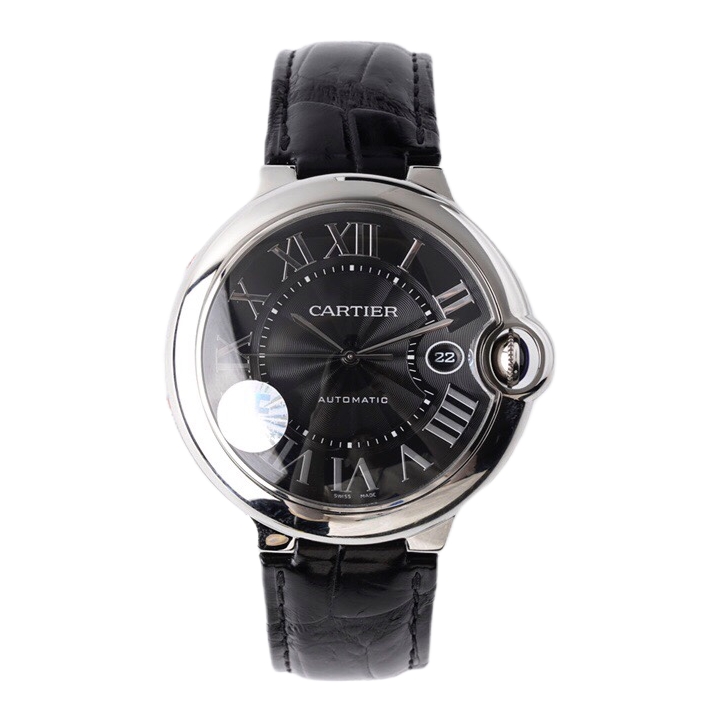Cartier Ballon Bleu 42mm Black Dial Steel Bezel Black Leather Strap WSBB0003