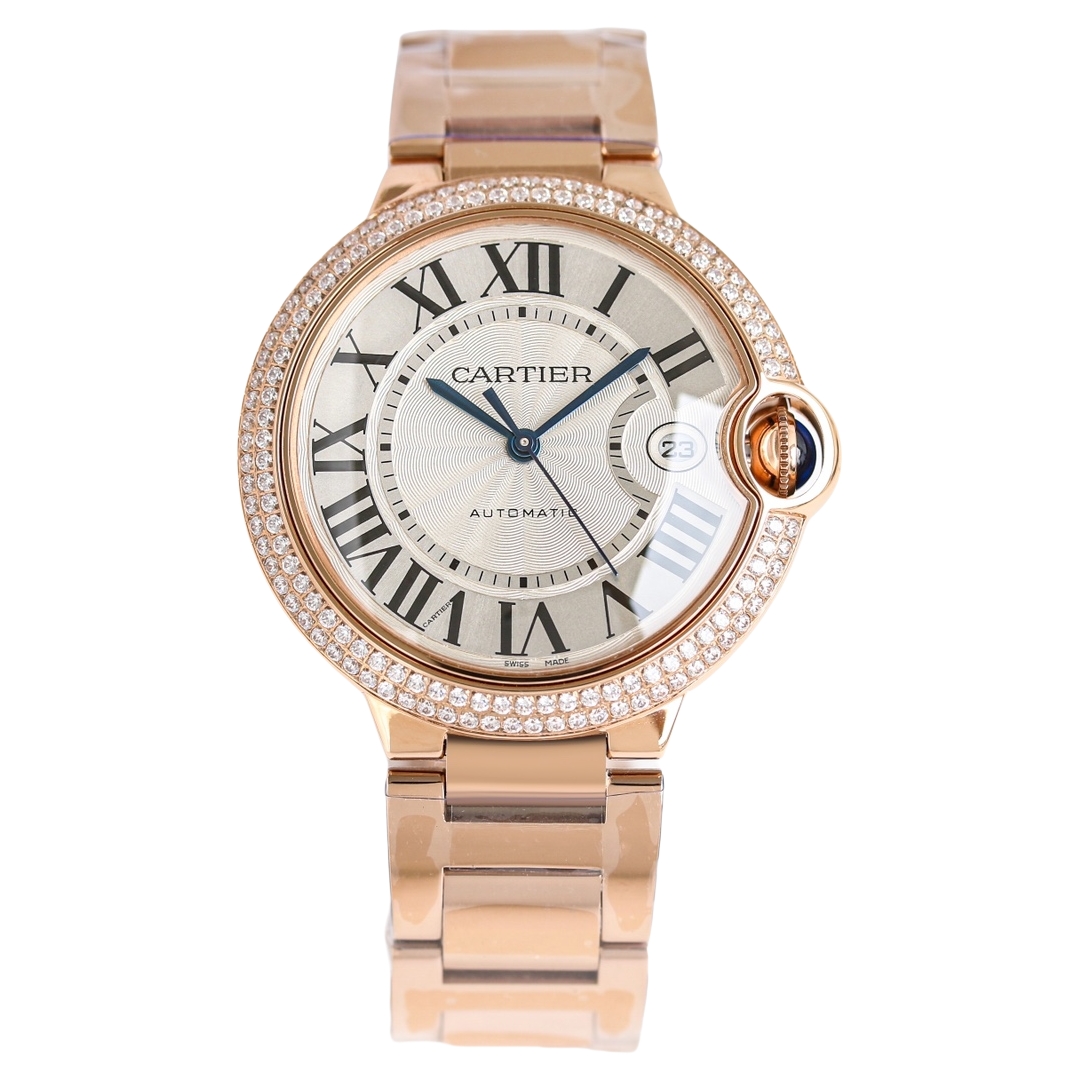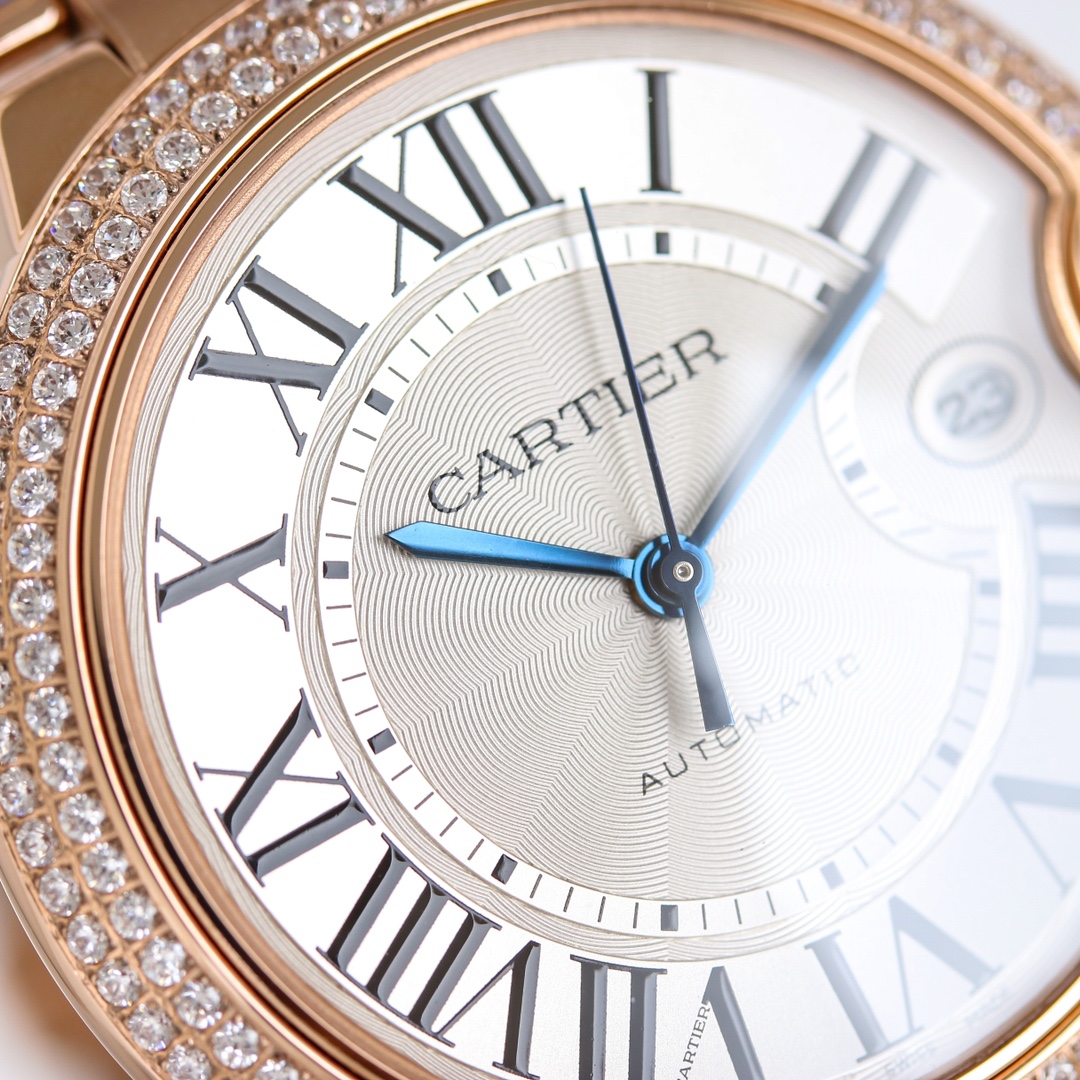 Cartier Ballon Bleu 42mm White Dial Double Row Diamond Bezel Rose Gold Strap WE9008Z3