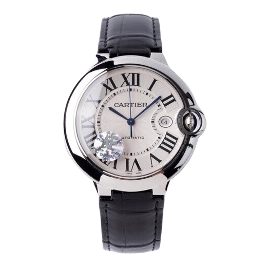 Cartier Ballon Bleu 42mm Silver Dial Steel Bezel Black Leather Strap WSBB0026