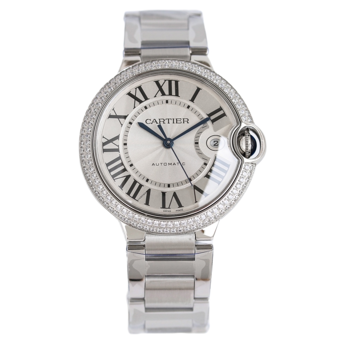 Cartier Ballon Bleu 42mm White Dial Double Row Diamond Bezel Steel Strap WE9009Z3