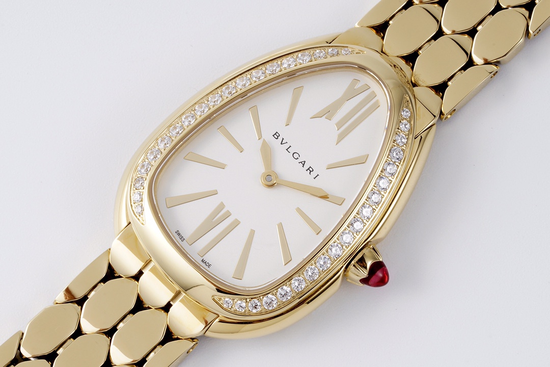BVLGARI Serpenti Spiga 35mm White Pearl Dial Yellow Gold Diamond Bezel Yellow Gold Diamond Strap 103747 Ladies Woman