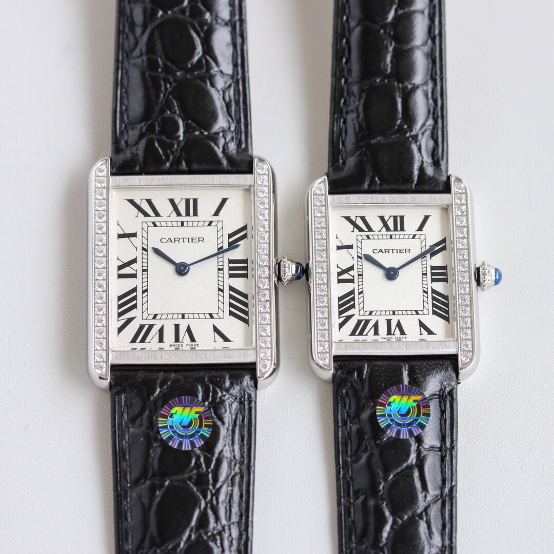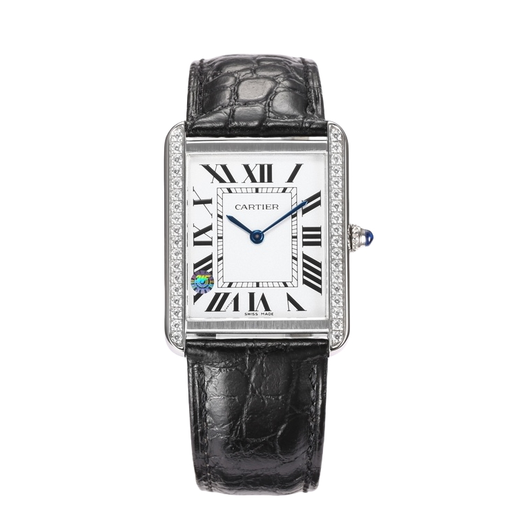 Cartier Tank 33.7mm x 25.5mm White Dial Steel Diamond Bezel Black Leather Strap W4TA0017 Woman Ladies