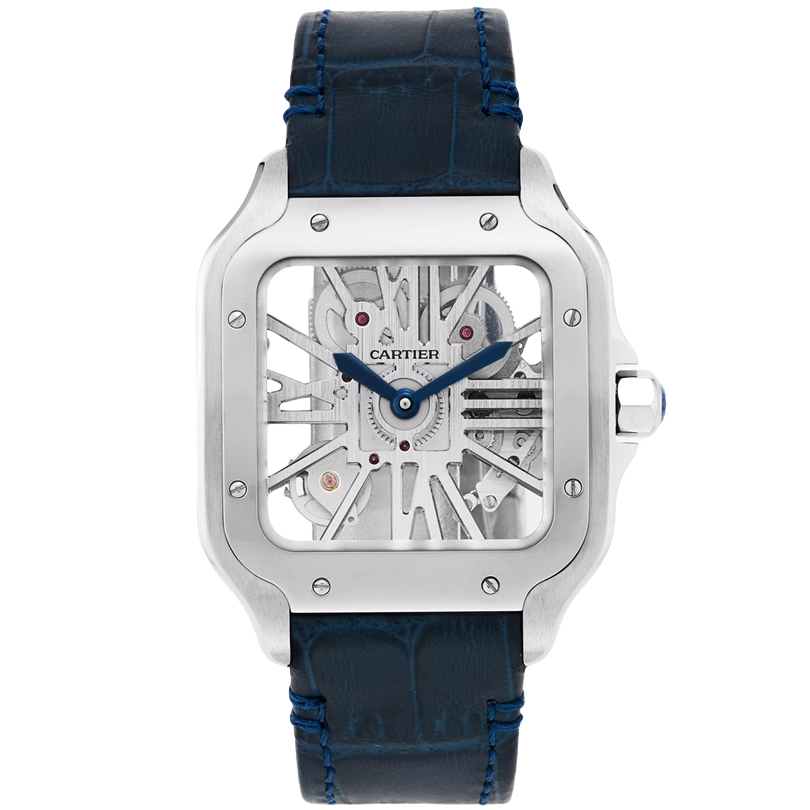 Cartier Santos 39.8mm Hollow Dial Steel Bezel Blue Leather Strap WHSA0021