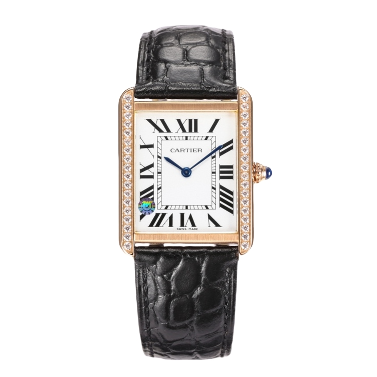 Cartier Tank 33.7mm x 25.5mm White Dial Rose Gold Diamond Bezel Black Leather Strap W4TA00X7 Woman Ladies