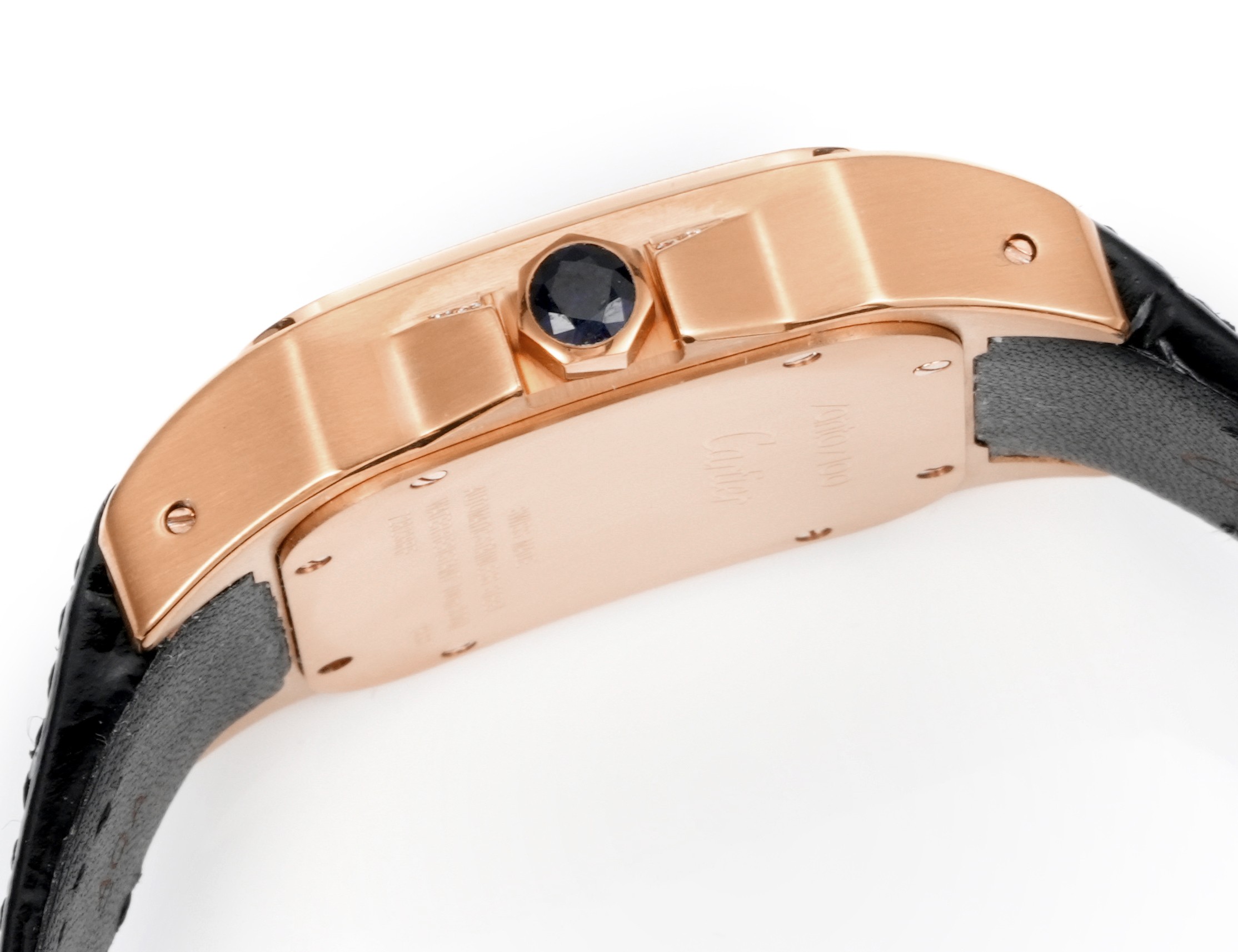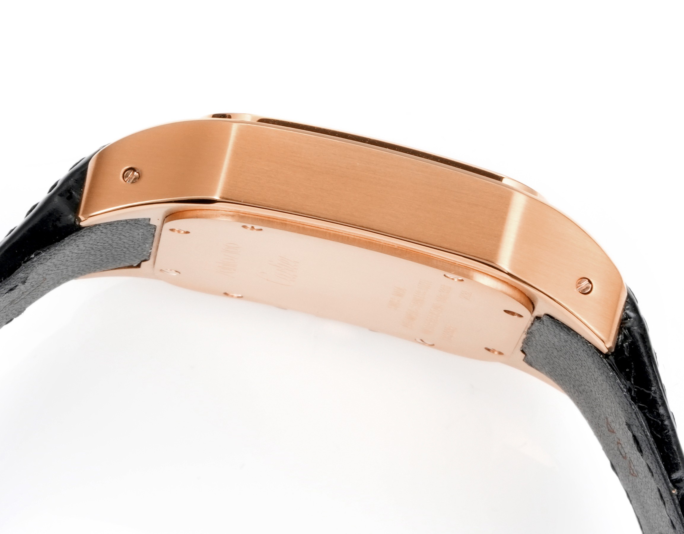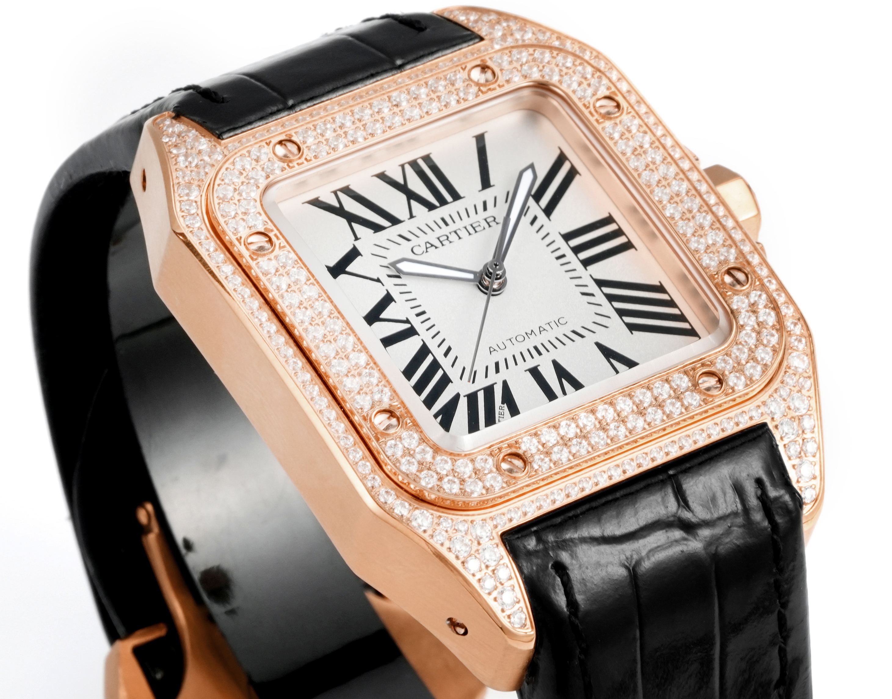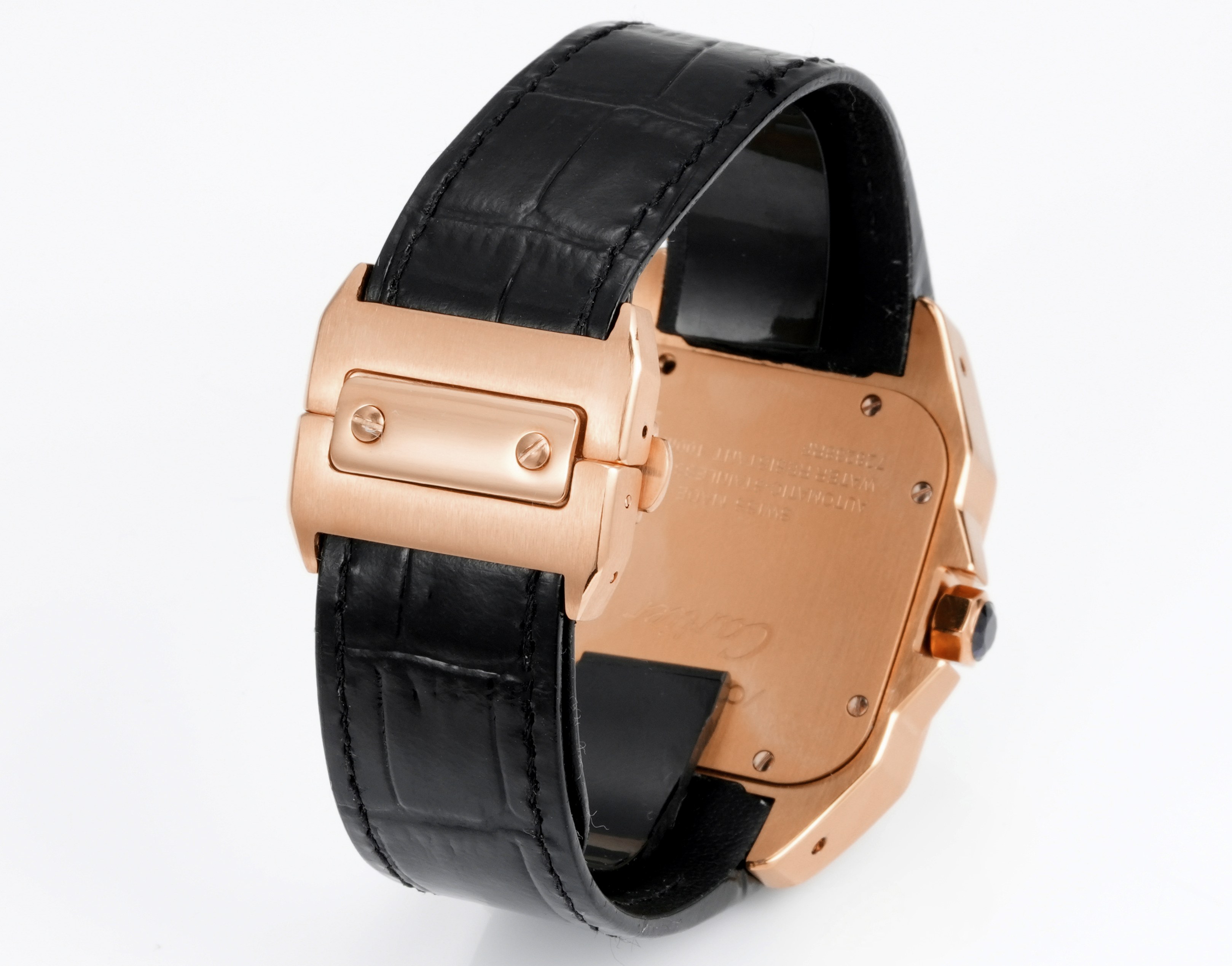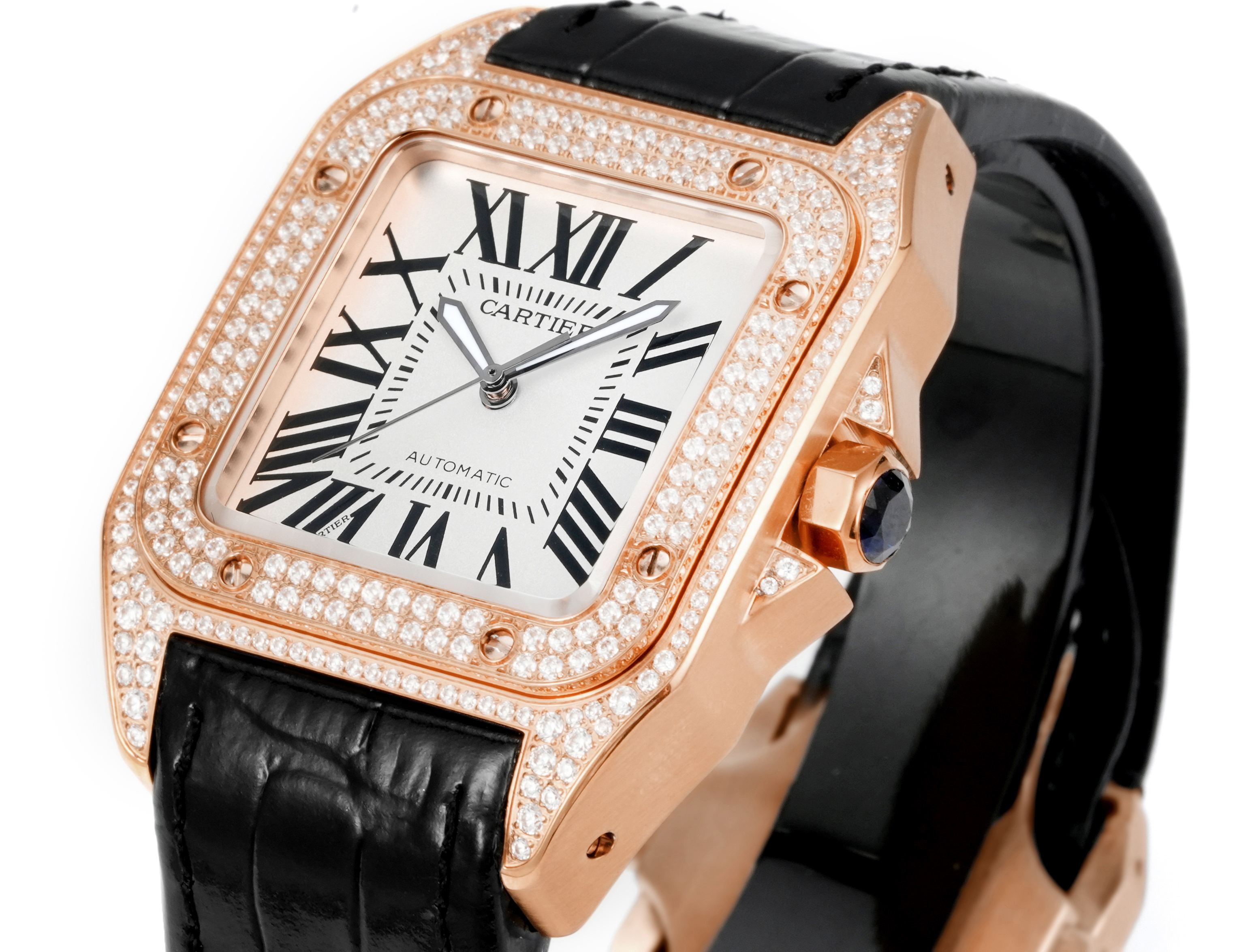 | Cartier Santos 41.3mm White Dial Rose Gold Diamond Bezel Black Leather Strap W26071Y1 | |