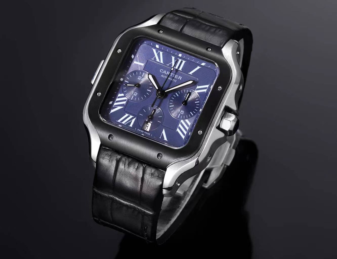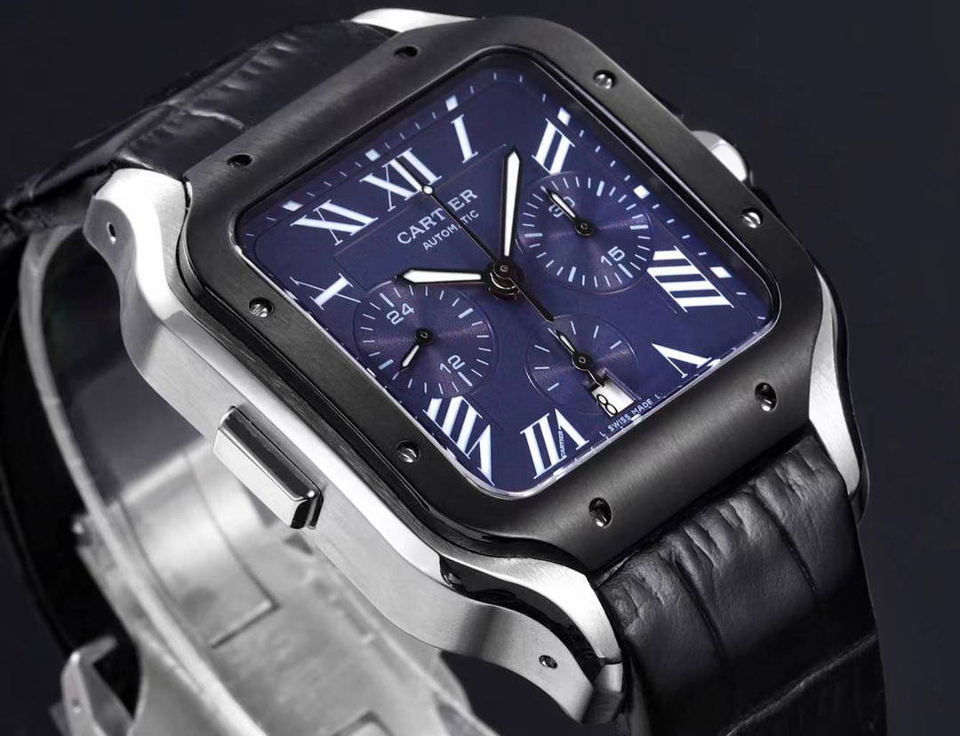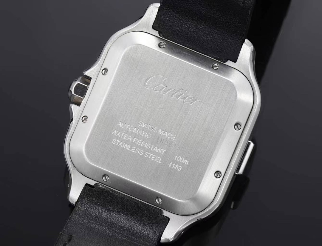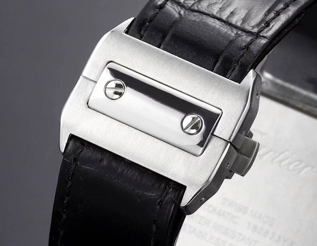 | Cartier Santos 43.3mm Blue Dial Steel Black Bezel Black Leather Strap WSSA0117 | |
