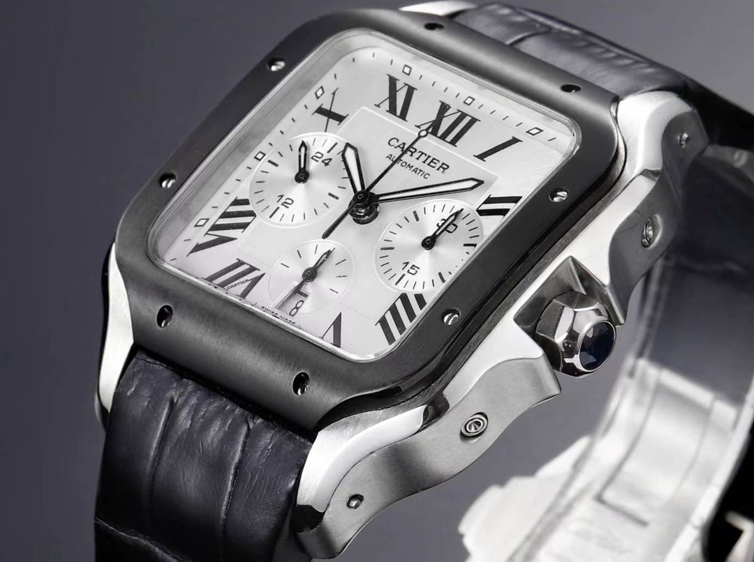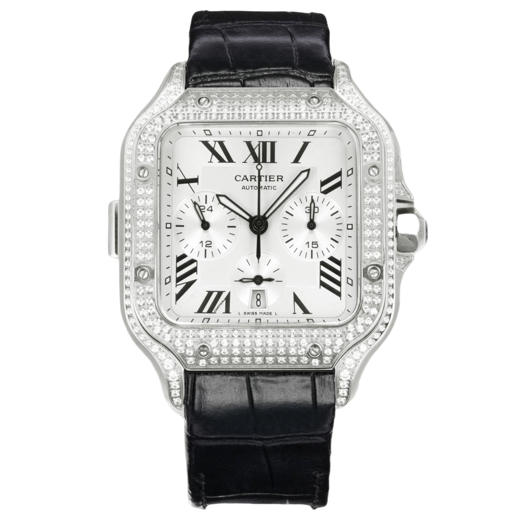 Cartier Santos 43.3mm White Dial Steel Diamond Bezel Black Leather Strap WSSA0G17