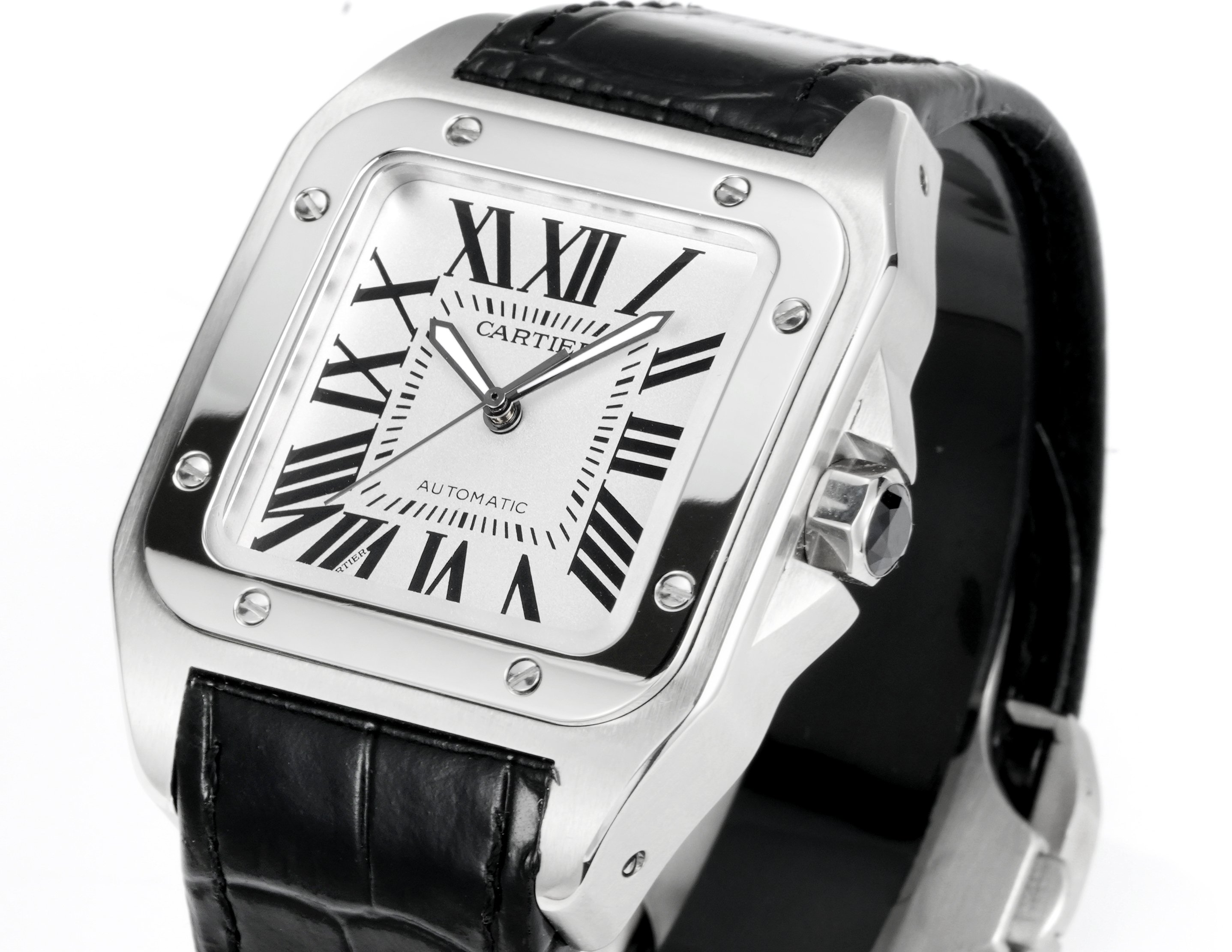 Cartier Santos 41.3mm White Dial Steel Diamond Bezel Black Leather Strap W25071Y1