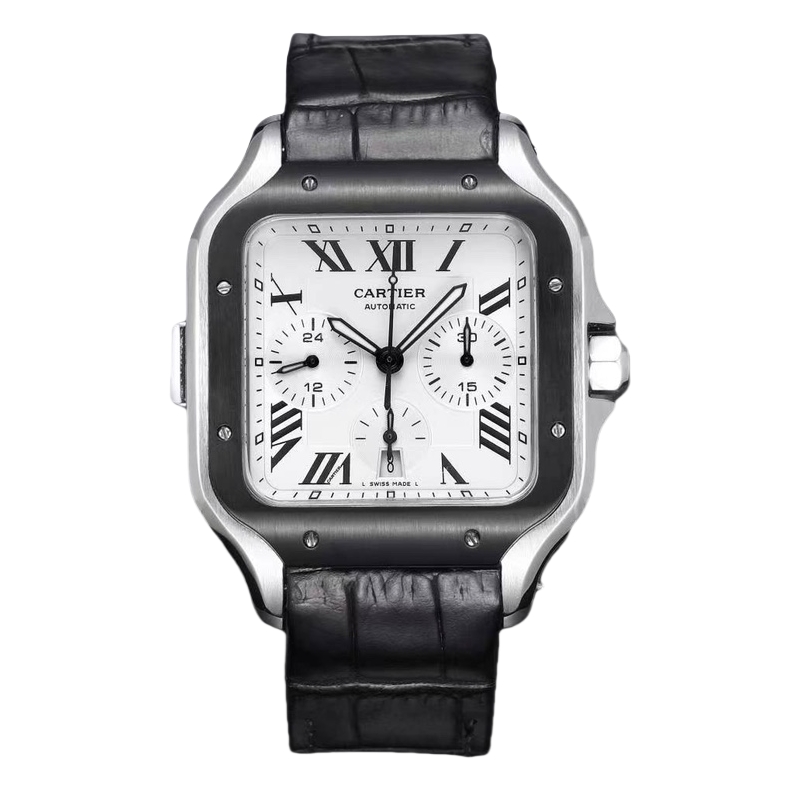 Cartier Santos 42mm White Dial Steel Bezel Black Leather Strap W20090X8