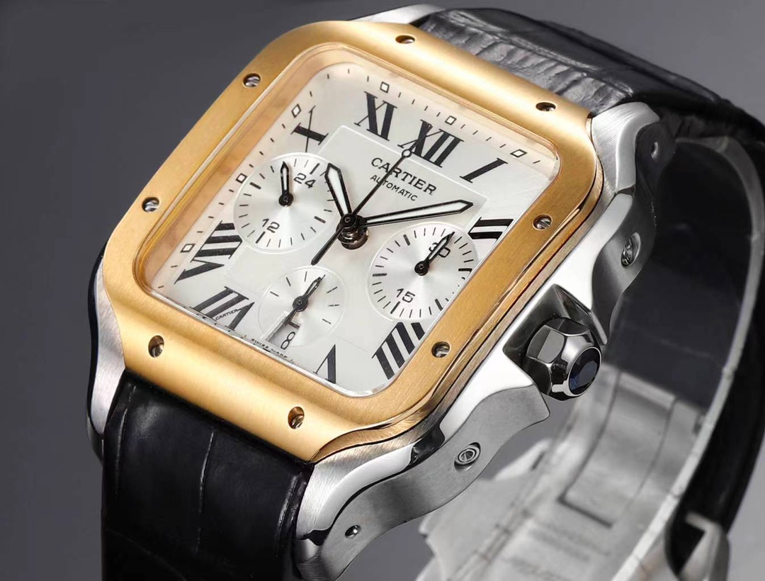 Cartier Santos 43.3mm White Dial Rose Gold Steel Diamond Bezel Black Leather Strap WSSAG017