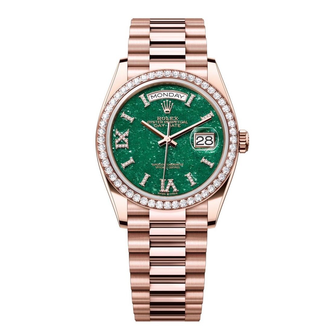 Rolex Day-Date 36mm Green Aventurine Diamond Dial Rose Gold Diamond Bezel 128235-0068 Woman Ladies