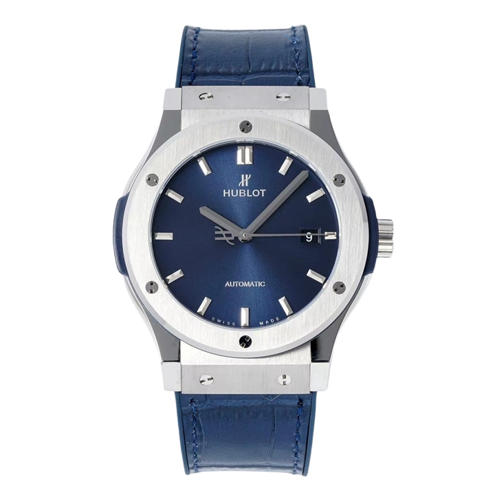 Hublot Classic Fusion 42mm Blue Dial Titanium Bezel Blue Crocodile Skin Strap 542.NX.7170.LR