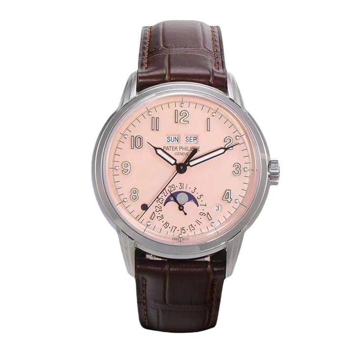 Patek Philippe Grand Complications 40mm Pink Dial Steel Bezel Brown Leather Strap 5320G-011