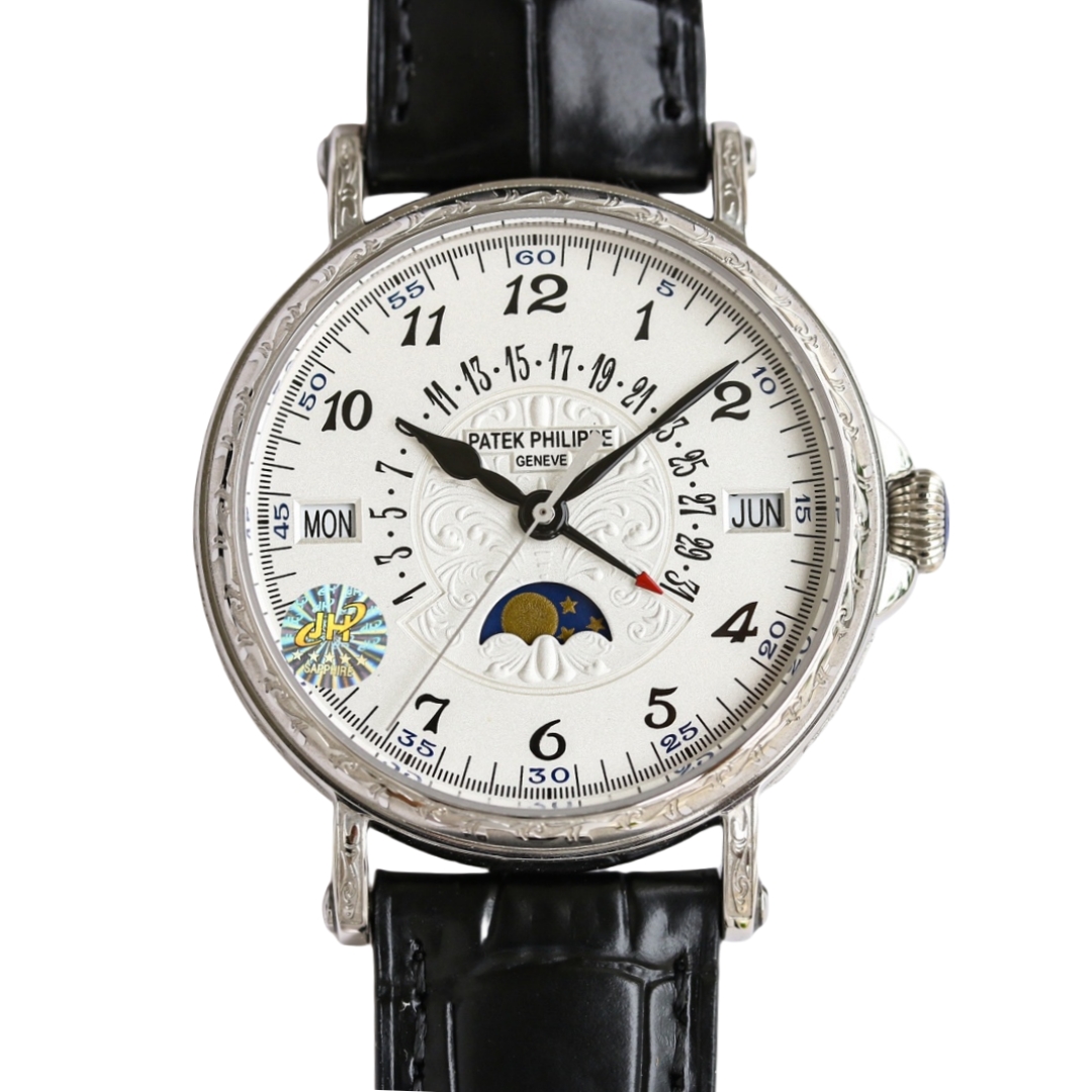 Patek Philippe Grand Complications 38mm White Dial Steel Carving Bezel Black Leather Strap 5160/500G-001