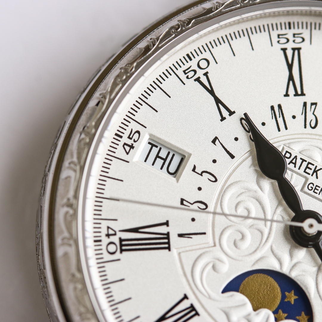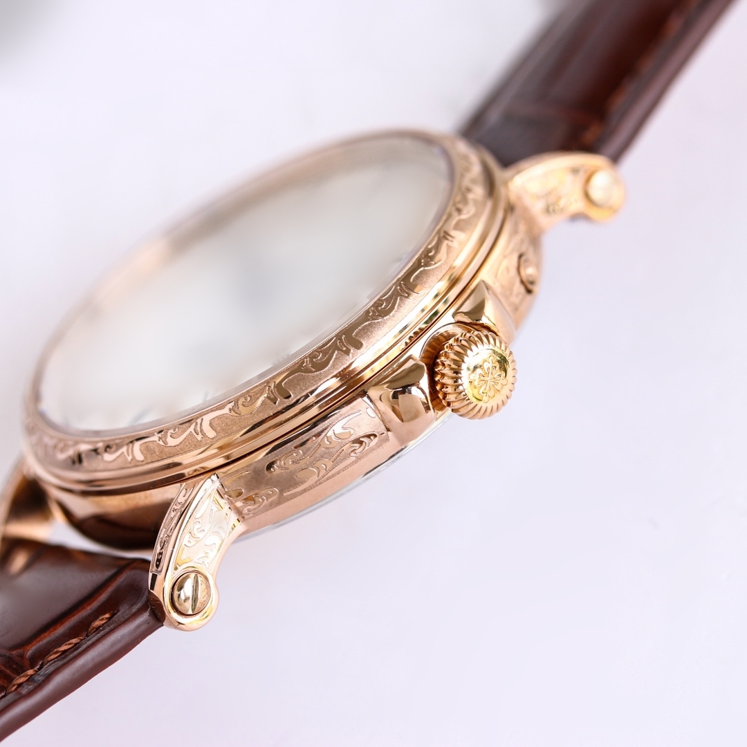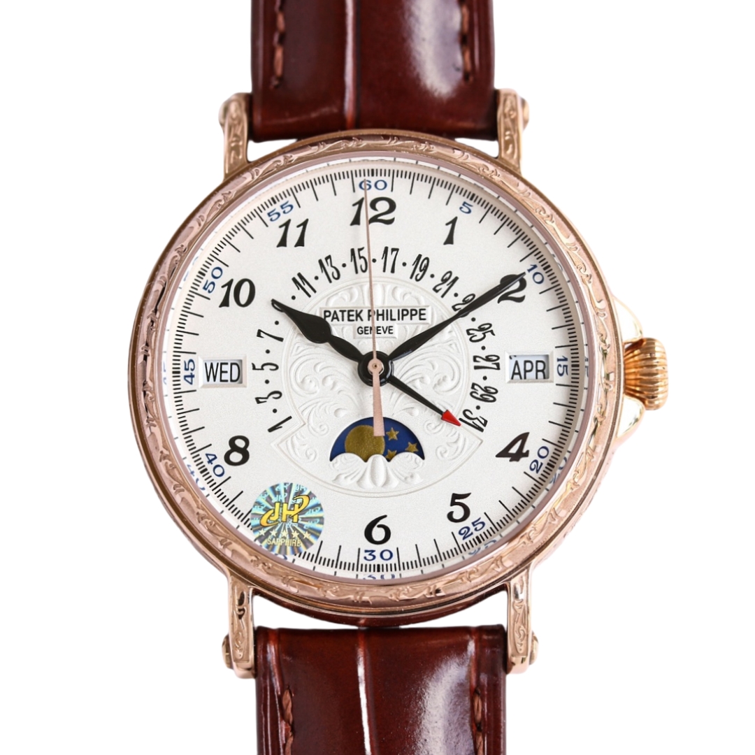 Patek Philippe Grand Complications 38mm White Dial Rose Gold Carving Bezel Brown Leather Strap 5160/500R-001