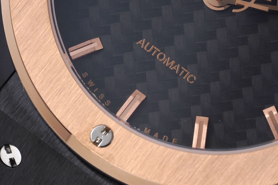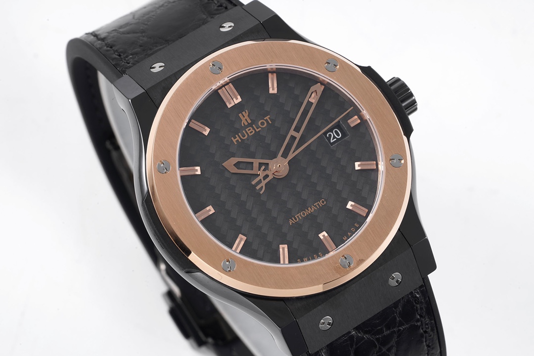 | Hublot Classic Fusion 42mm Yellow Gold Carbon Fiber Dial Black Ceramics Bezel Black Crocodile Skin Strap 541.CO.1781.LR | |