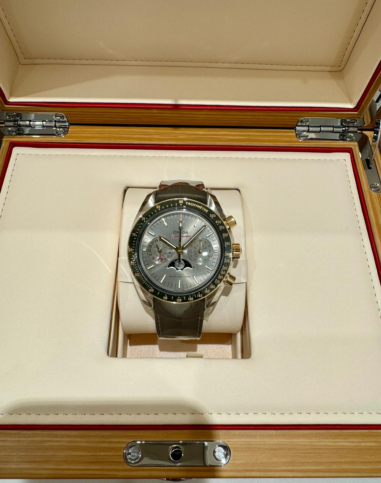 | Omega Speedmaster Phase Of The Moon 44.25mm Grey Dial Green Yellow Gold Bezel Grey Leather 304.33.44 | |