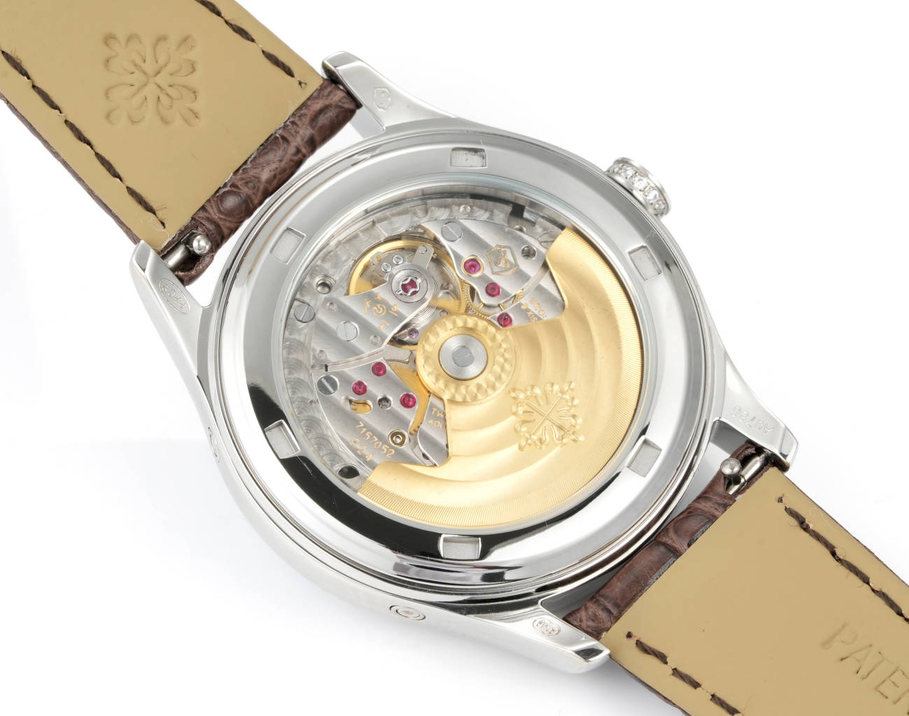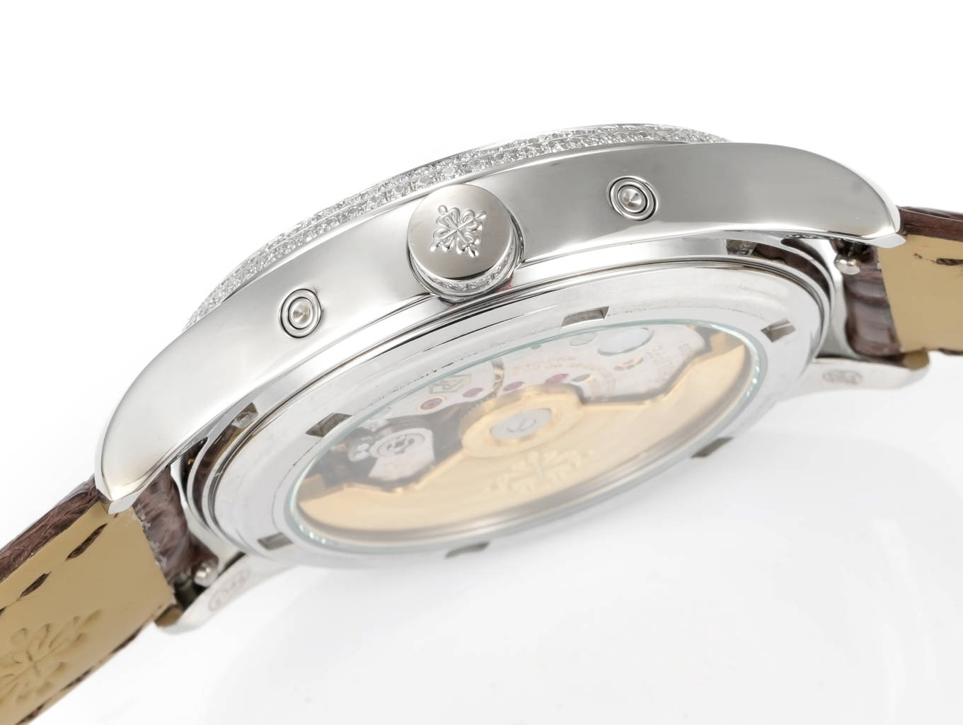 | Patek Philippe Complications 37mm Pearl Dial Diamond Bezel Brown Leather Strap 4936G-001 Woman Ladies | |