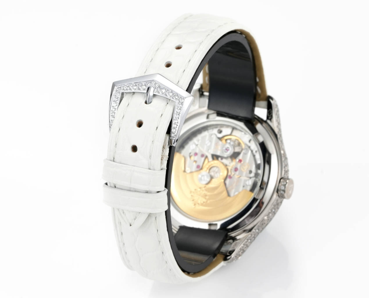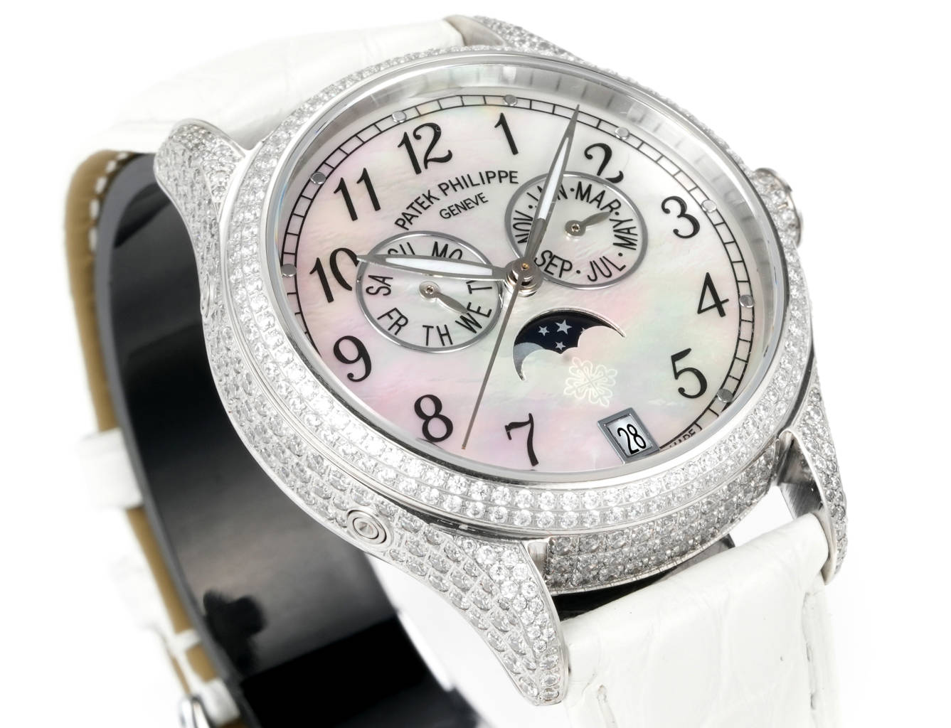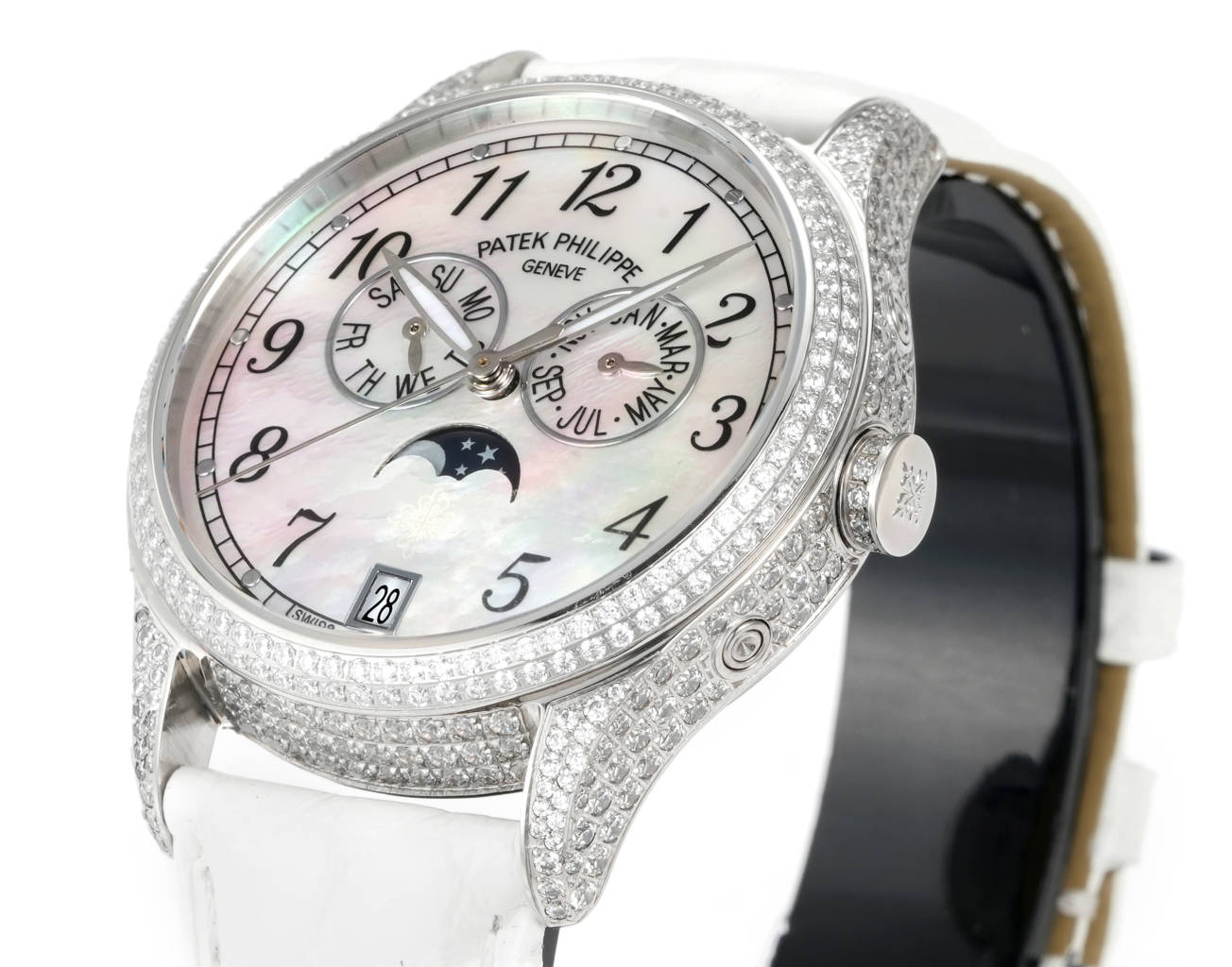 | Patek Philippe Complications 37mm White Pearl Dial Diamond Bezel White Leather Strap 4937G-001 Woman Ladies | |