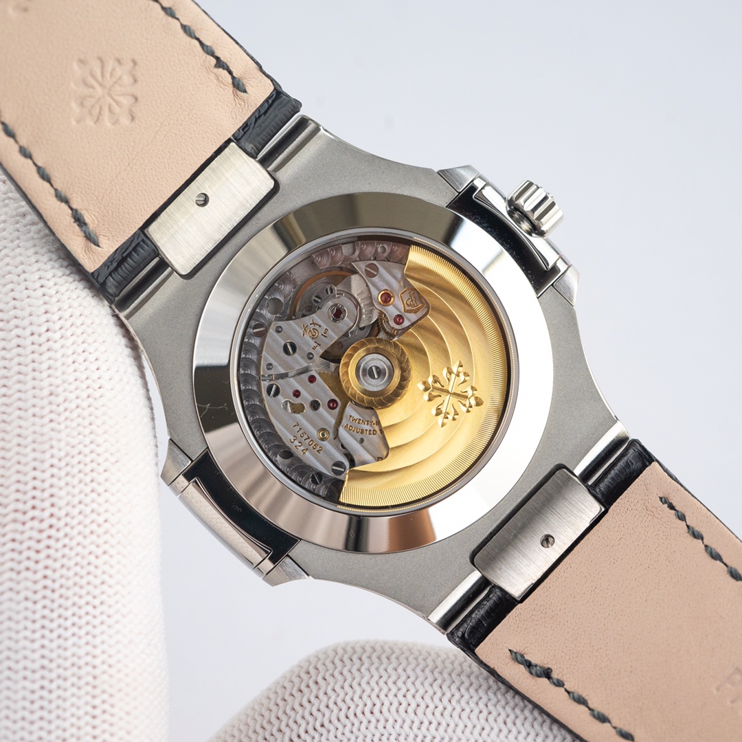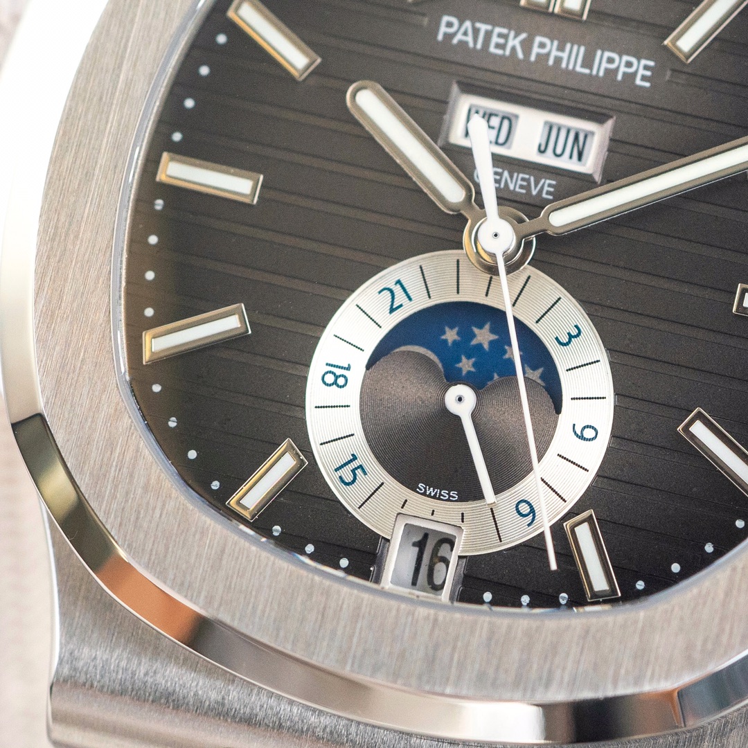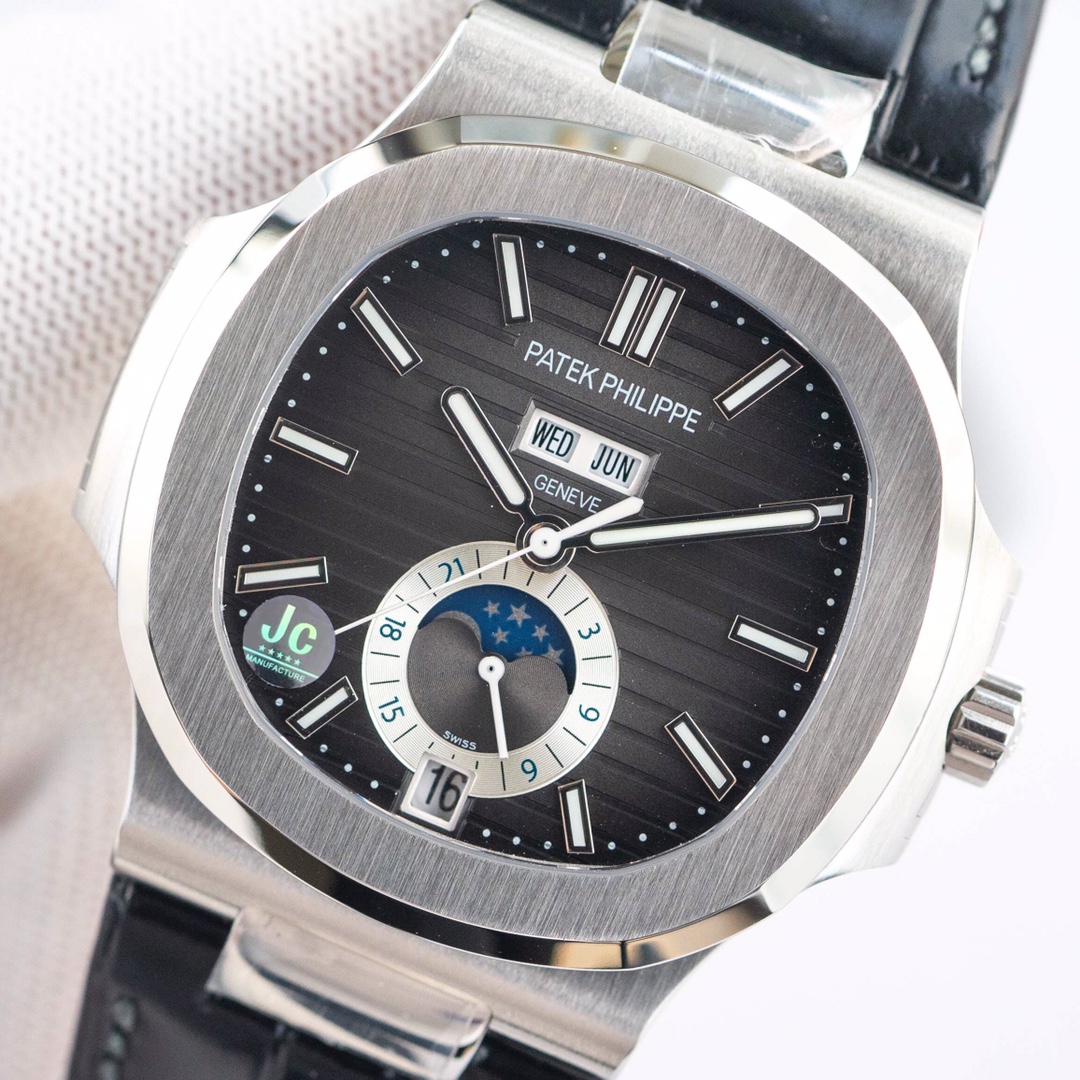 | Patek Philippe Nautilus 40mm Black Grey Dial Steel Bezel Black Leather Moon Phase 5726A-001 | |