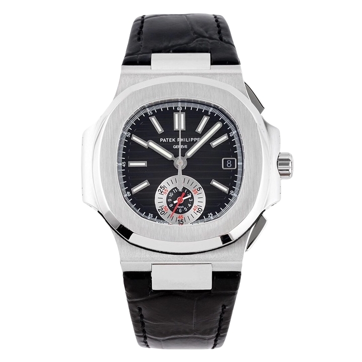 Patek Philippe Nautilus 40.5mm Black Dial Steel Bezel Black Leather Complications 5980