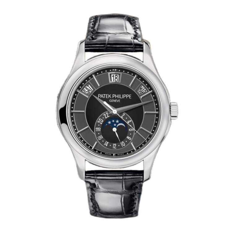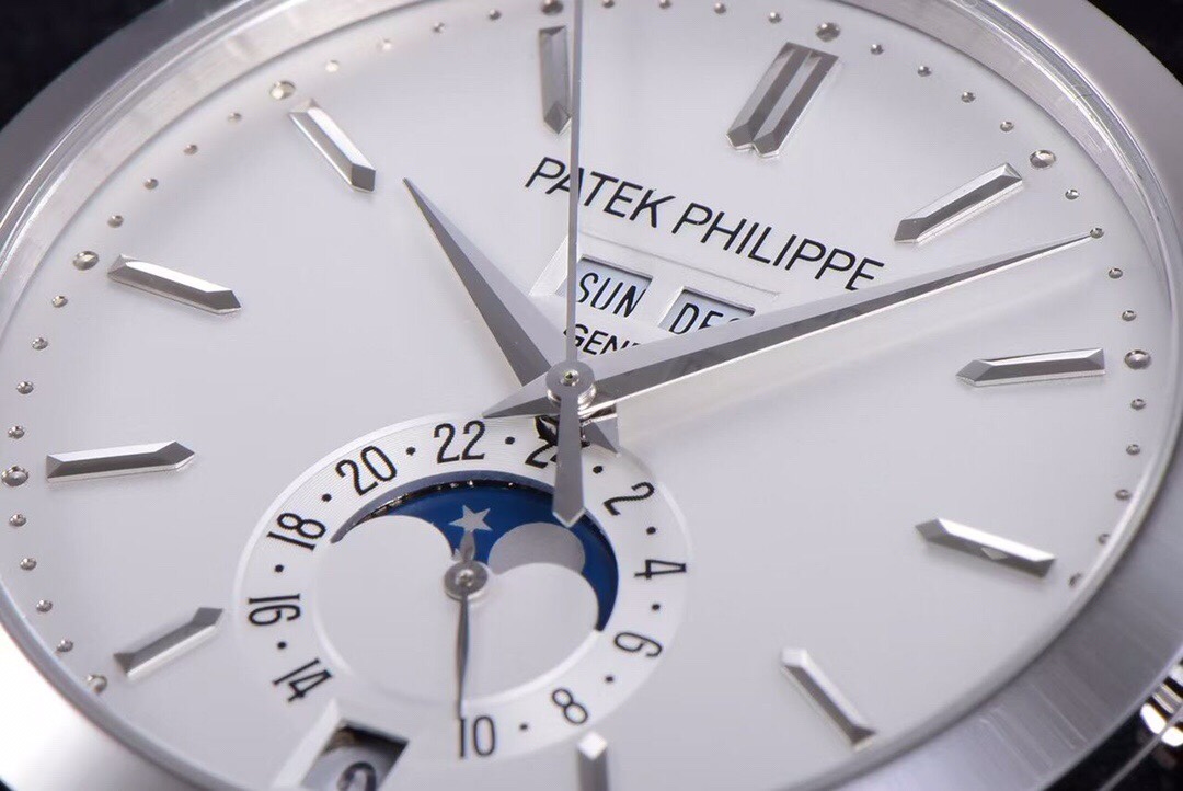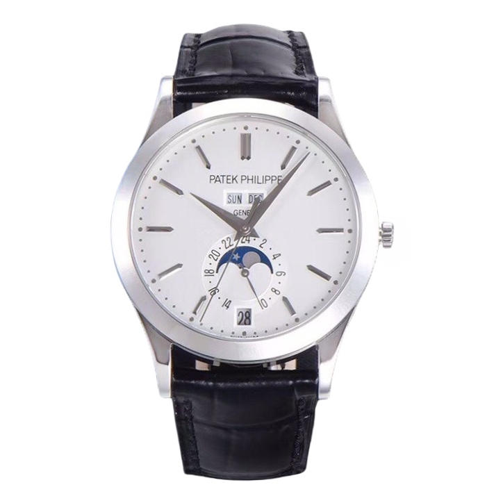 Patek Philippe Complications 38.5mm White Dial Steel Bezel Black Leather Strap 5396G-011