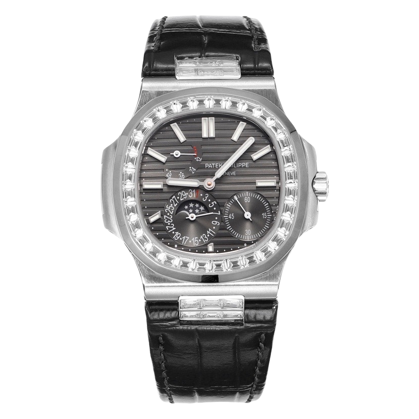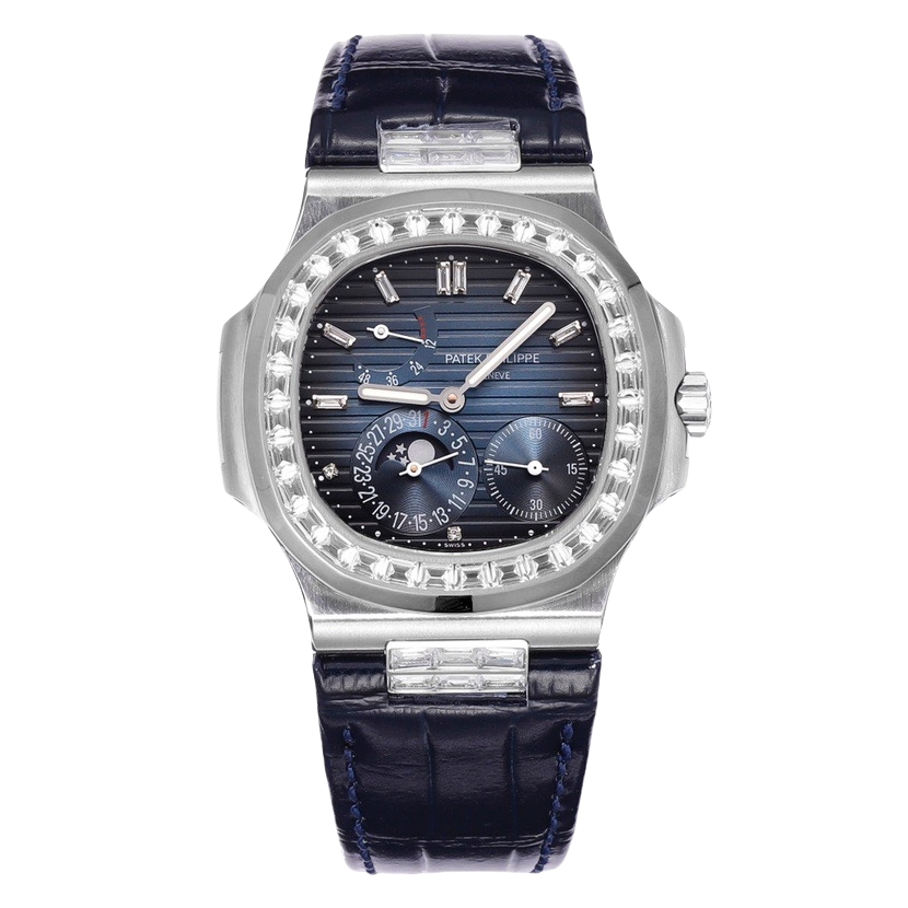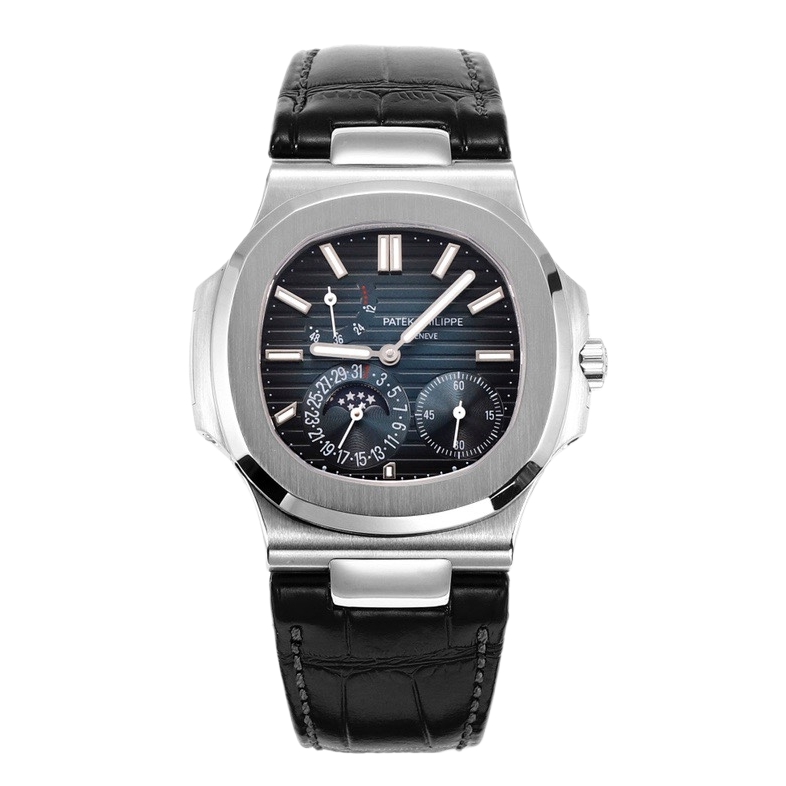 Patek Philippe Nautilus 40mm Black Blue Moon Phase Dial Platinum Bezel Black Leather 5712G-001