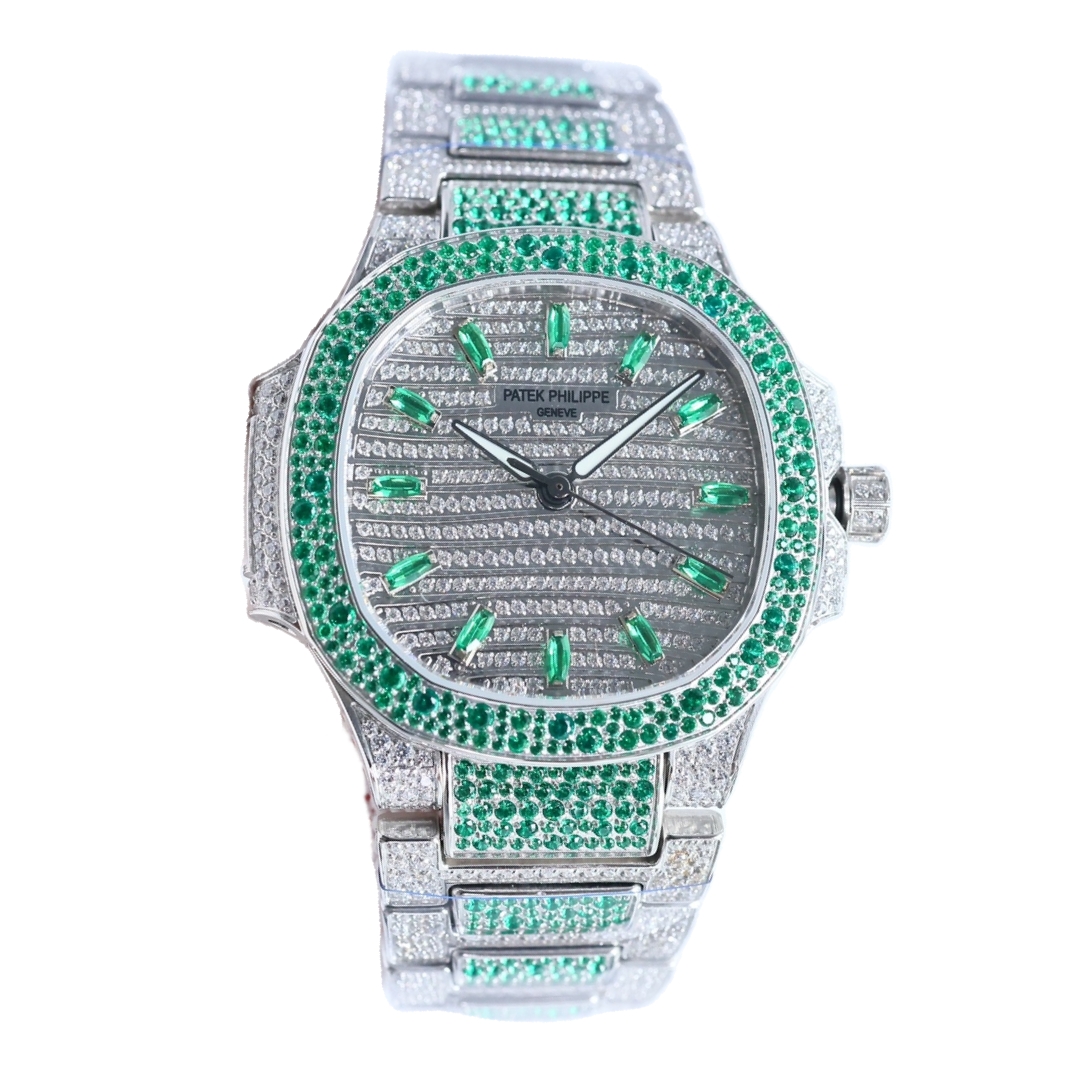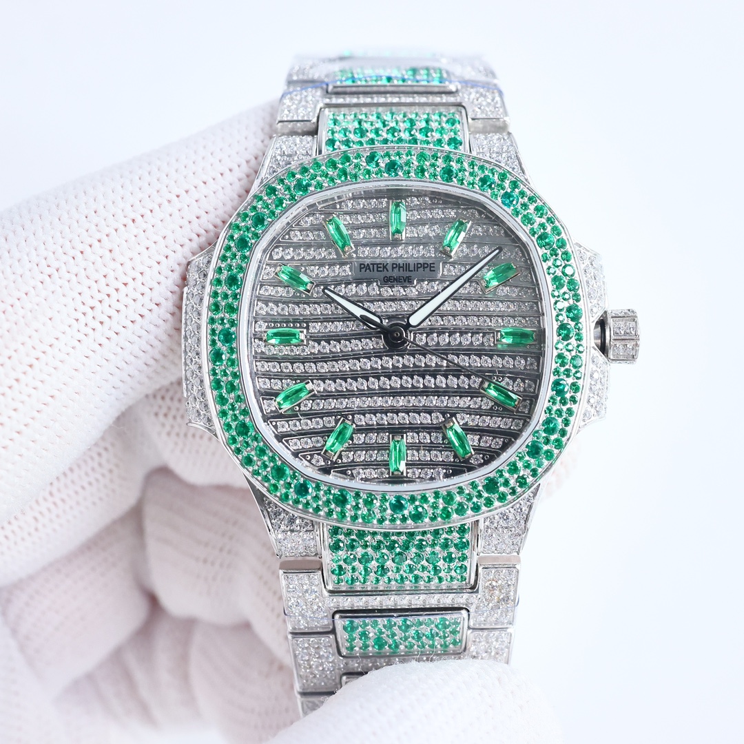 Patek Philippe Nautilus 35.2mm Green Gen Full Diamond Dial Platinum Bezel 7118/1453G-001 Woman Ladies