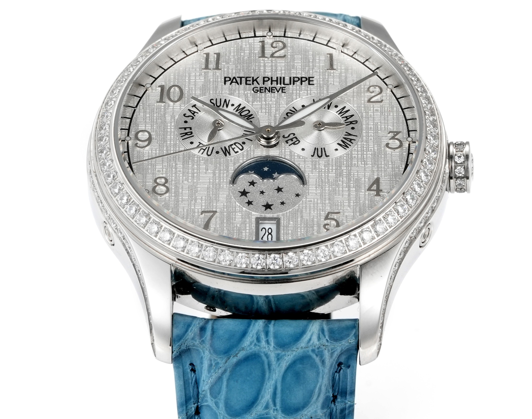 Patek Philippe Complications 38mm White Satin Dial Steel Diamond Bezel Blue Leather Strap 4947G-010 Woman Ladies