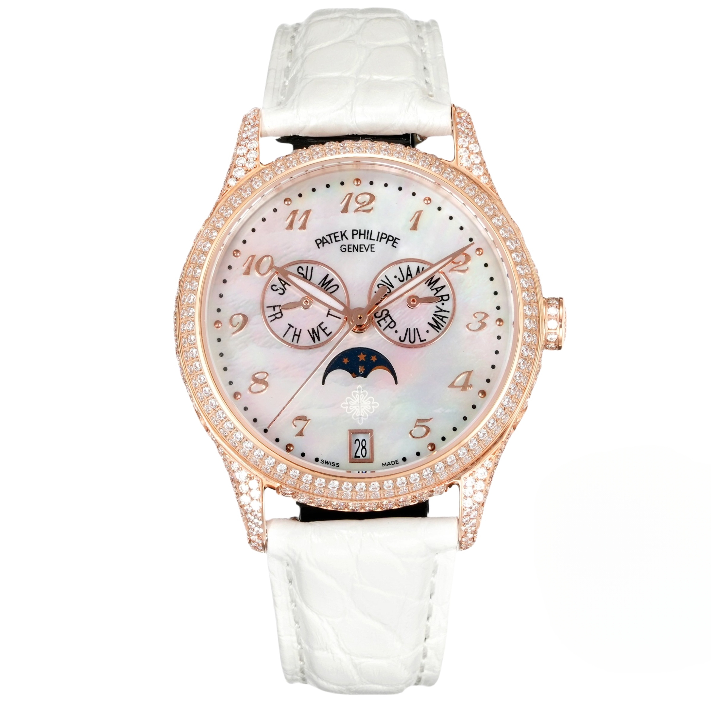Patek Philippe Complications 37mm White Pearl Dial Rose Gold Diamond Bezel White Leather Strap 4936R-001 Woman Ladies