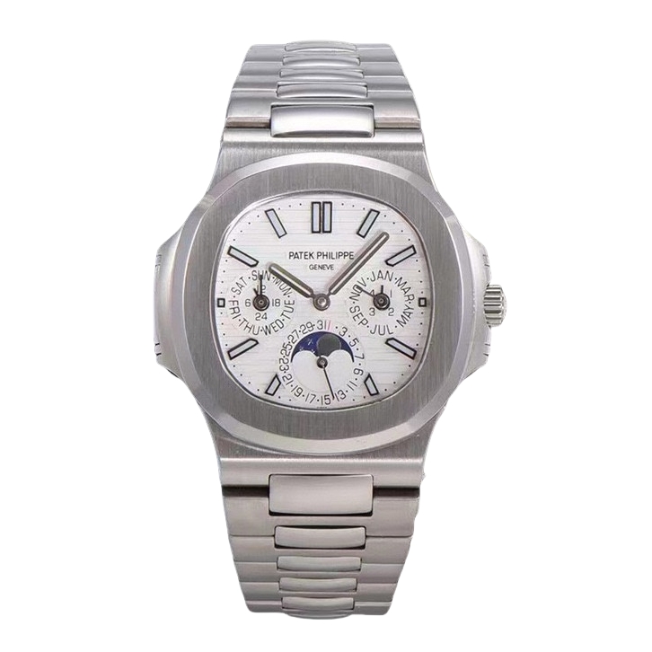 Patek Philippe Nautilus 40mm White Moon Phase Dial Platinum Bezel Complications 5740