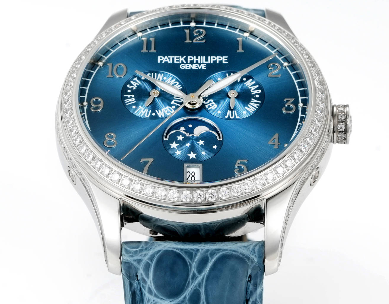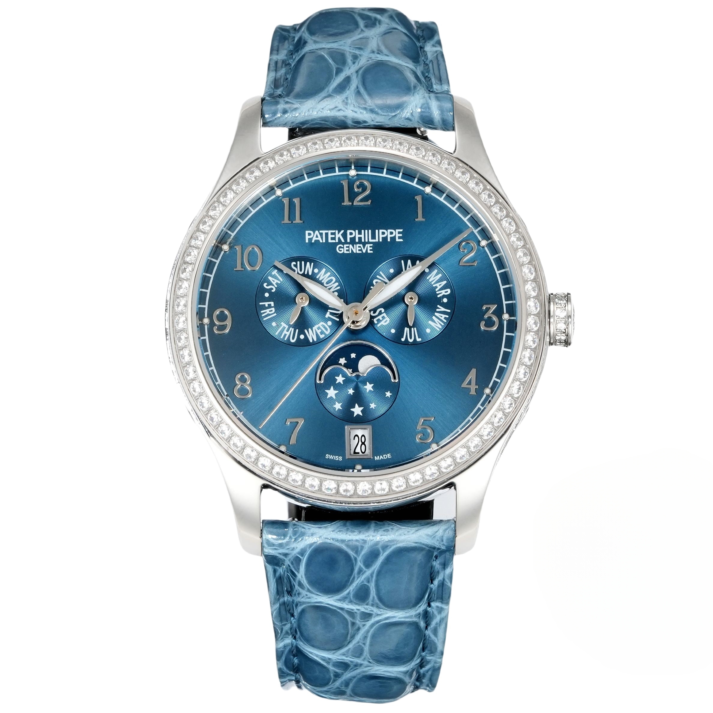 Patek Philippe Complications 38mm Blue Dial Steel Diamond Bezel Blue Leather Strap 4947G-001 Woman Ladies