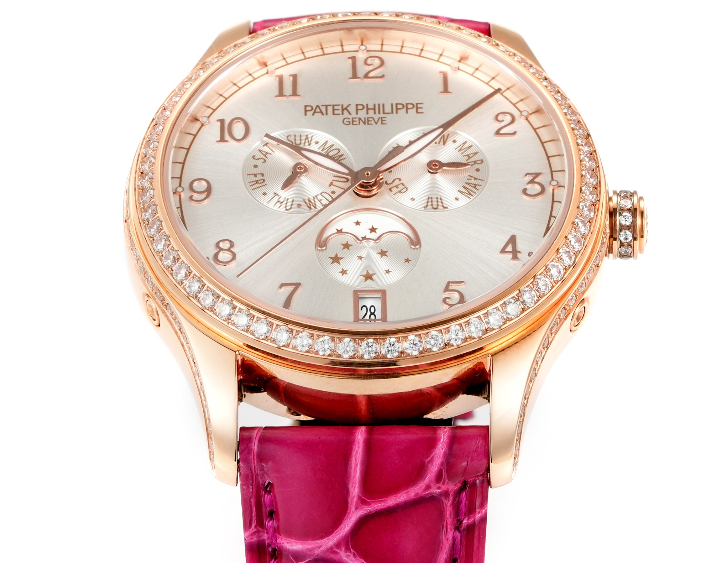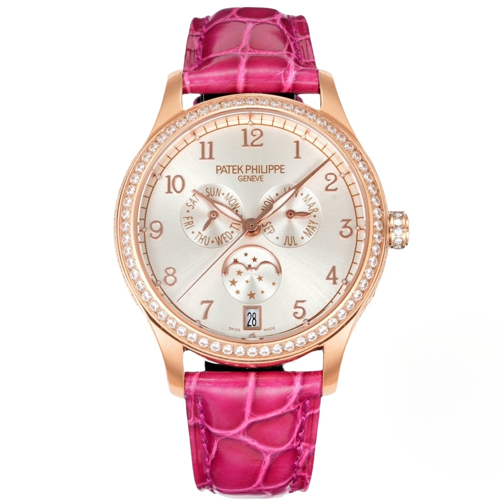 Patek Philippe Complications 38mm Silver Dial Rose Gold Diamond Bezel Rose Red Leather Strap 4947R-001 Woman Ladies