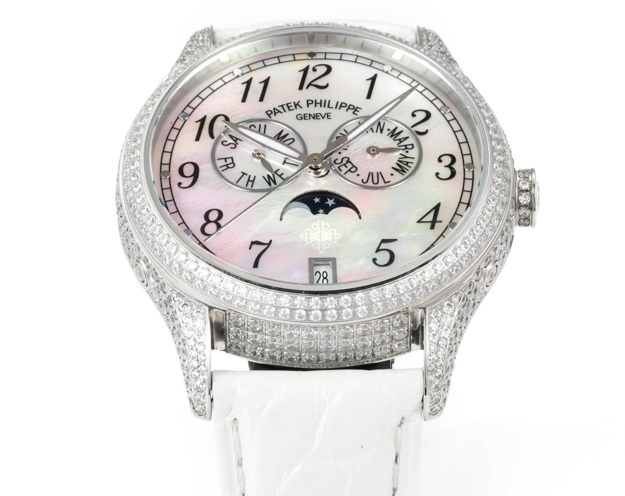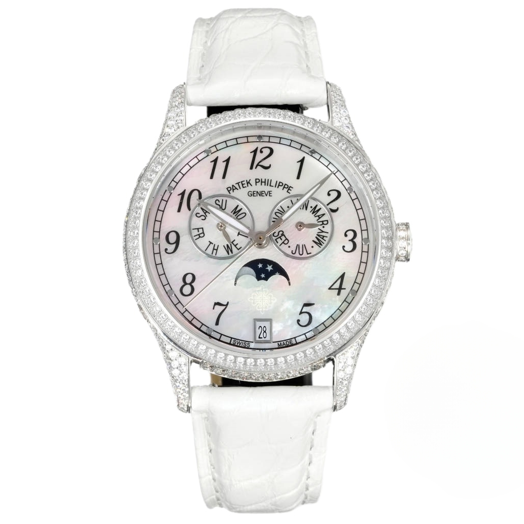 Patek Philippe Complications 37mm White Pearl Dial Diamond Bezel White Leather Strap 4937G-001 Woman Ladies