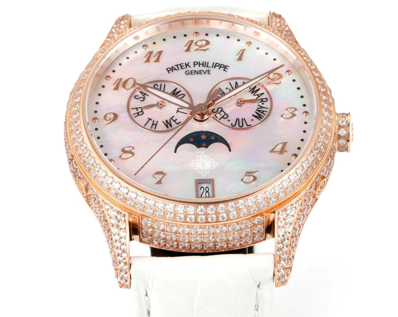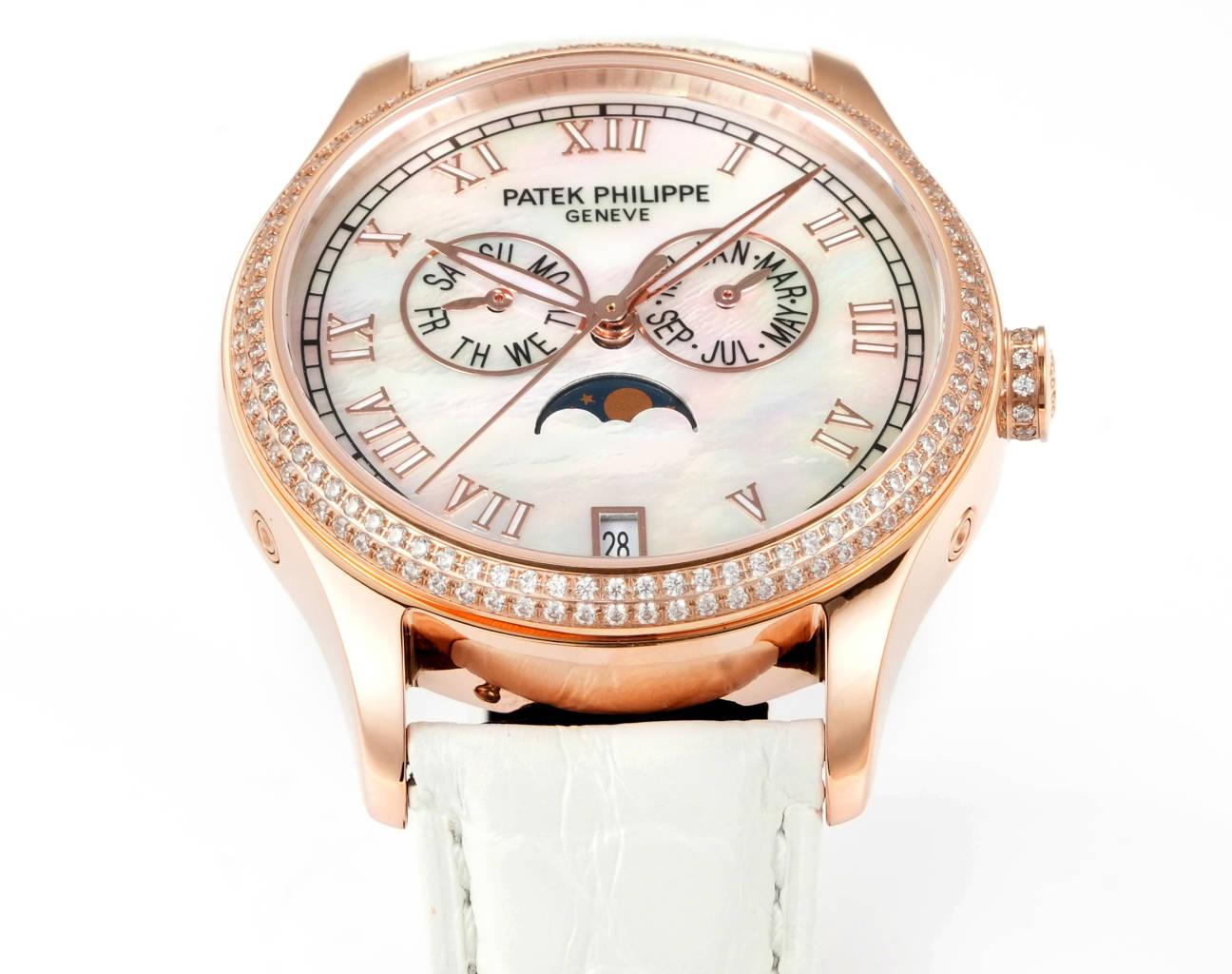 Patek Philippe Complications 37mm White Pearl Dial Rose Gold Diamond Bezel White Leather Strap 4937R-001 Woman Ladies