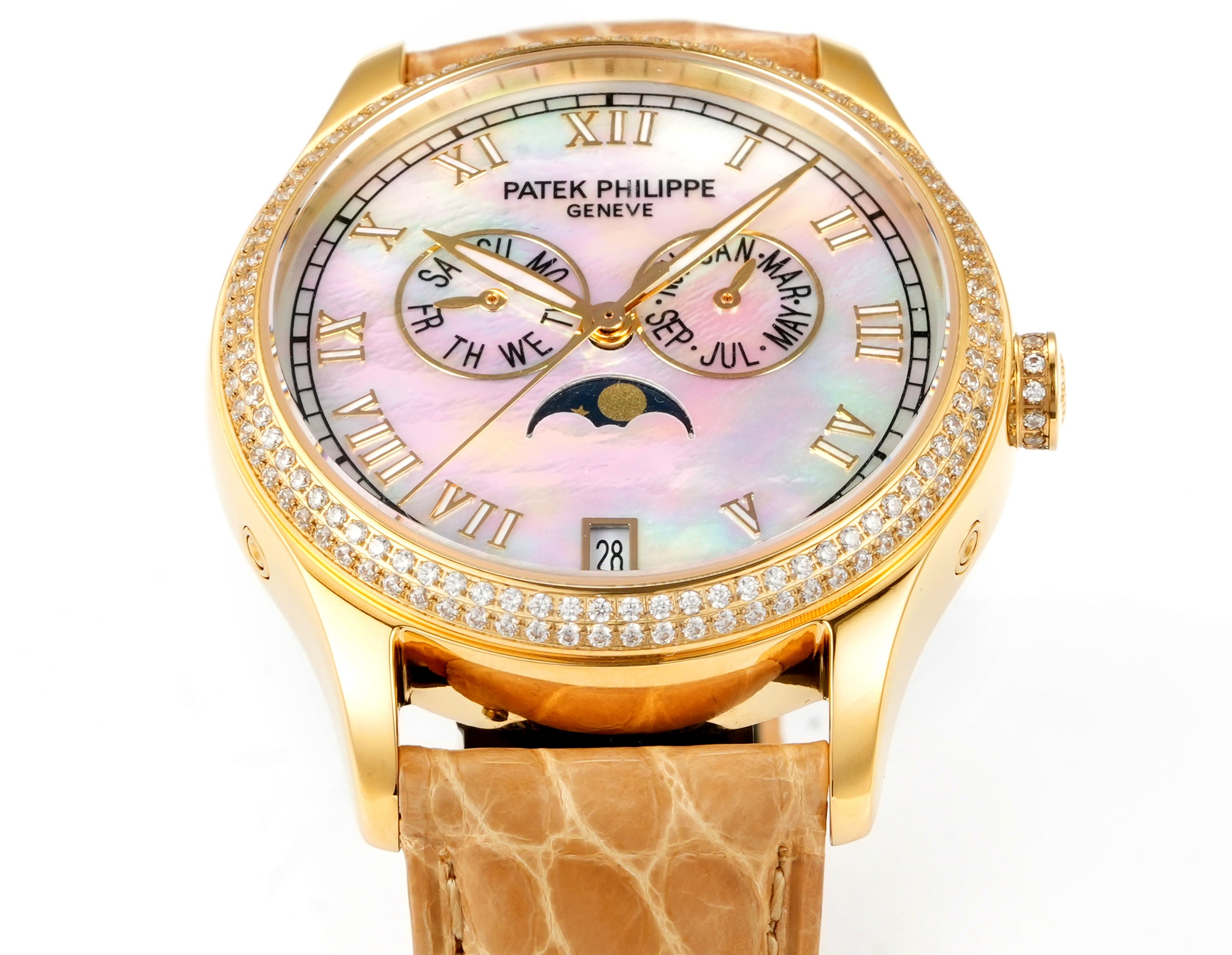 Patek Philippe Complications 37mm Pearl Dial Diamond Bezel Brown Leather Strap 4936G-001 Woman Ladies