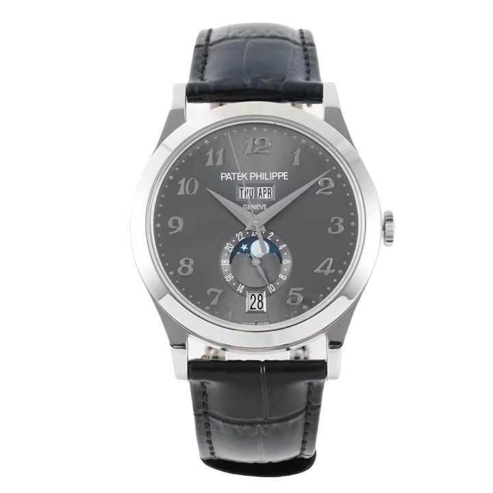 Patek Philippe Complications 38.5mm Carbon Gray Dial Steel Bezel Black Leather Strap 5396G-014