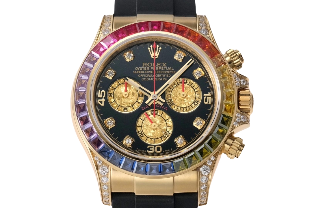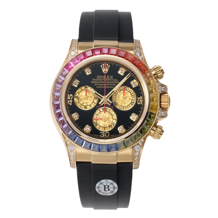 Rolex Daytona Rainbow 40mm Black Dial Yellow Gold Diamond Bezel Black Rubber Strap 116598RBOW