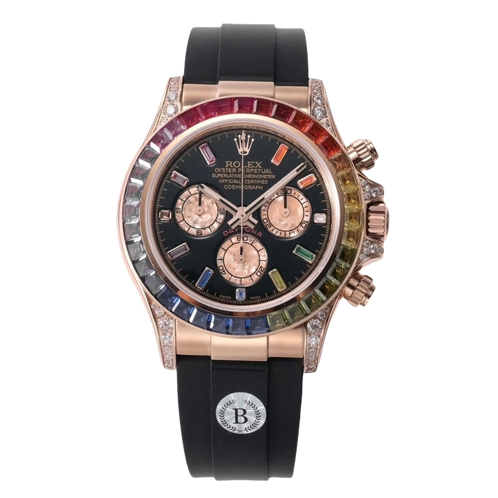 Rolex Daytona Rainbow 40mm Black Dial Rose Gold Diamond Bezel Black Rubber Strap 116595 RBOW