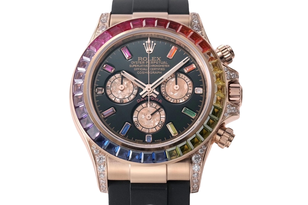 Rolex Daytona Rainbow 40mm Diamond Dial Rose Gold Diamond Bezel Black Rubber Strap 116595RBOW-0004