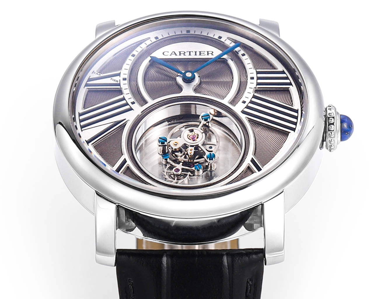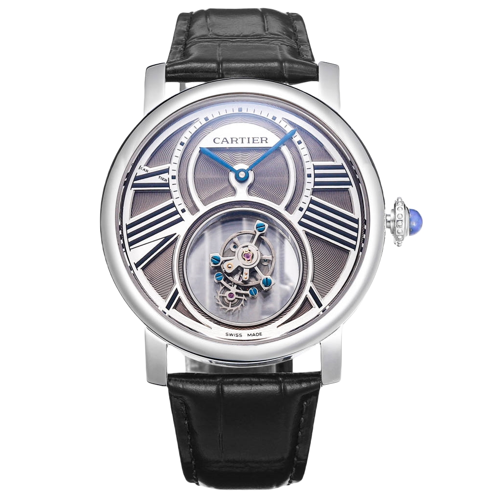 Cartier Rotonde 45mm Hollow Dial Steel Bezel Black Leather Strap W1556210