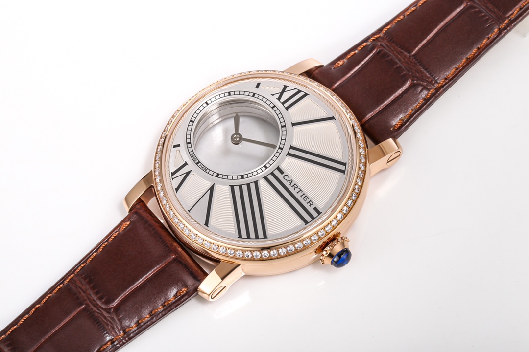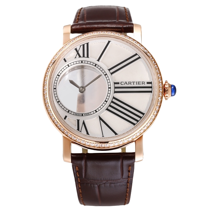 Cartier Rotonde 42mm Hollow Dial Rose Gold Diamond Bezel Brown Leather Strap WD1556223