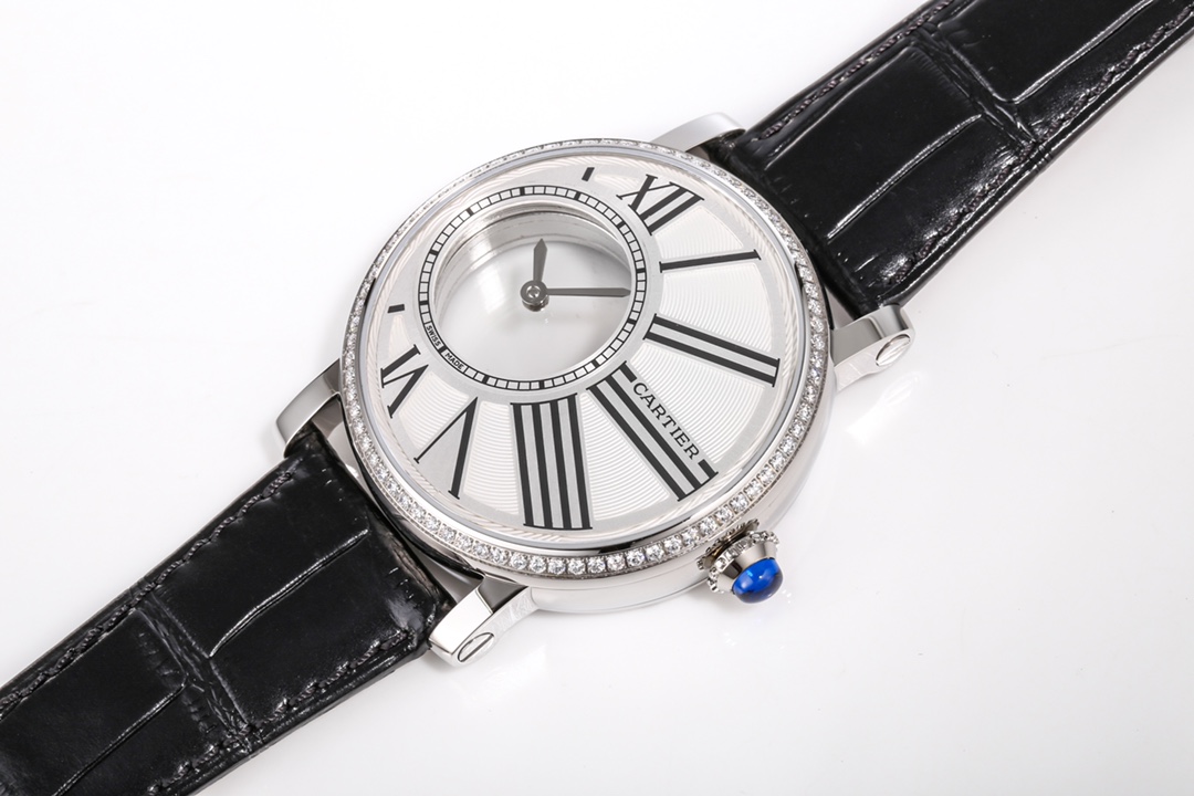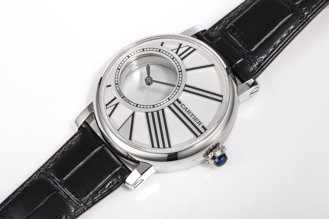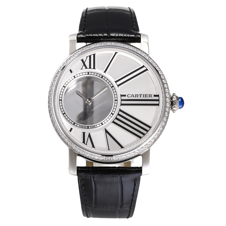 Cartier Rotonde 42mm Hollow Dial Steel Diamond Bezel Black Leather Strap WD1556224