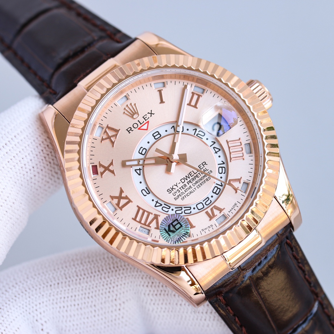 | Rolex Sky-Dweller 42mm Pink Dial Rose Gold Bezel Brown Leather 326135-0004 | |
