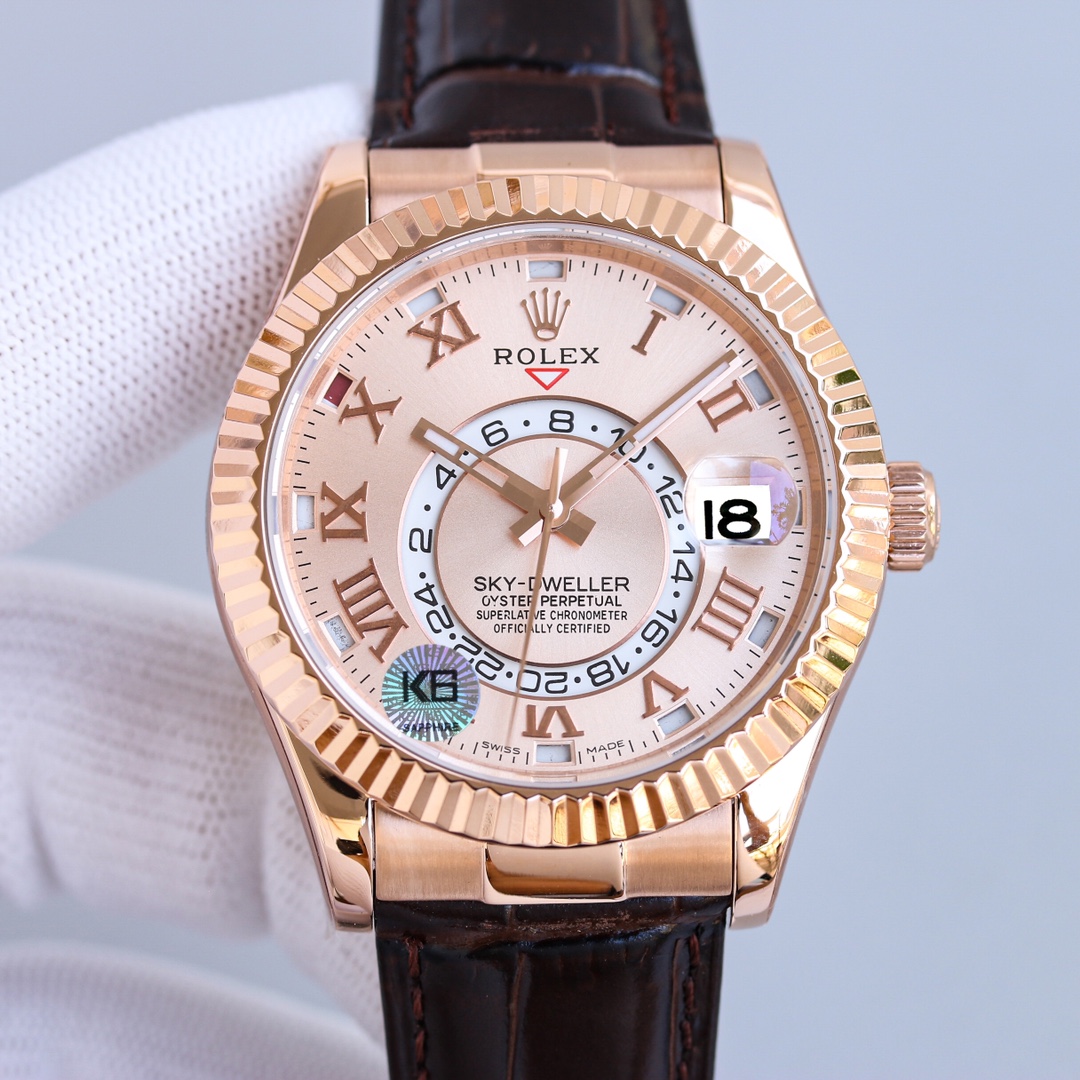Rolex Sky-Dweller 42mm Pink Dial Rose Gold Bezel Brown Leather Roman Numeral 326135-0004