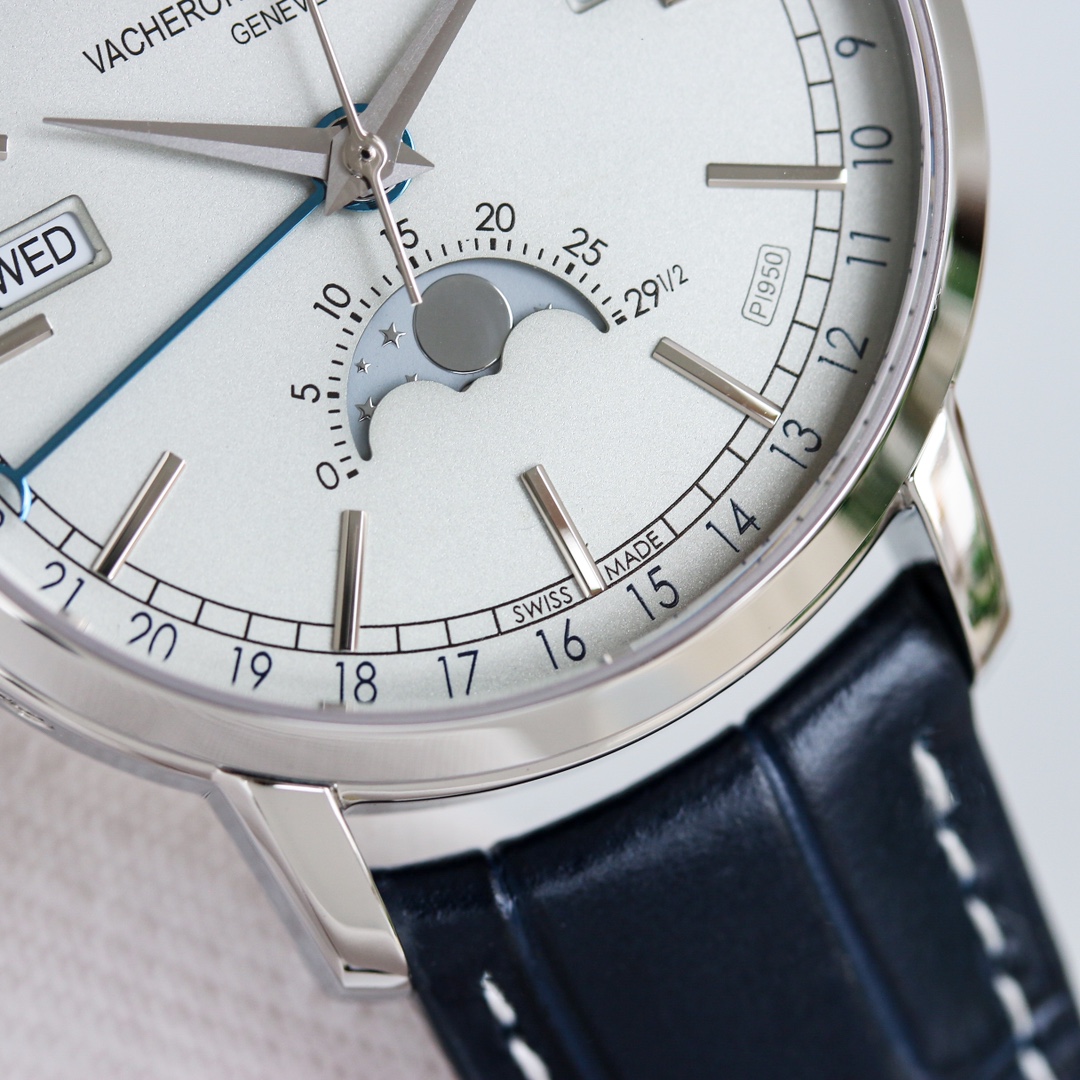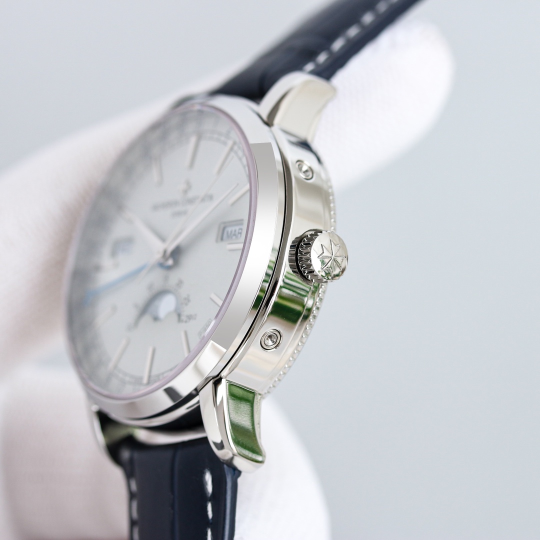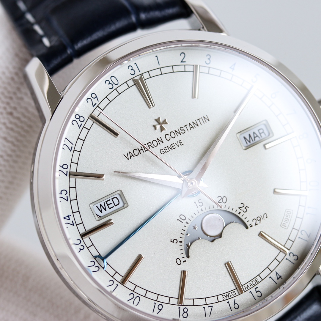 [Dial]: The track-type minute scale and the toffee-style hour and minute hands retain the iconic calendar display created by Vacheron Constantin. The day and month windows are symmetrically distributed on both sides of the dial, and the digital bezel on the outer edge of the dial is a calendar display. It is gently lifted by an elegant black crescent hand for easy reading. The ingenious design breaks the dullness of the dial. This layout clearly shows the precise moon phase display at 6 o'clock. While showing the smart charm, it also shows the unique beauty of complex machinery.