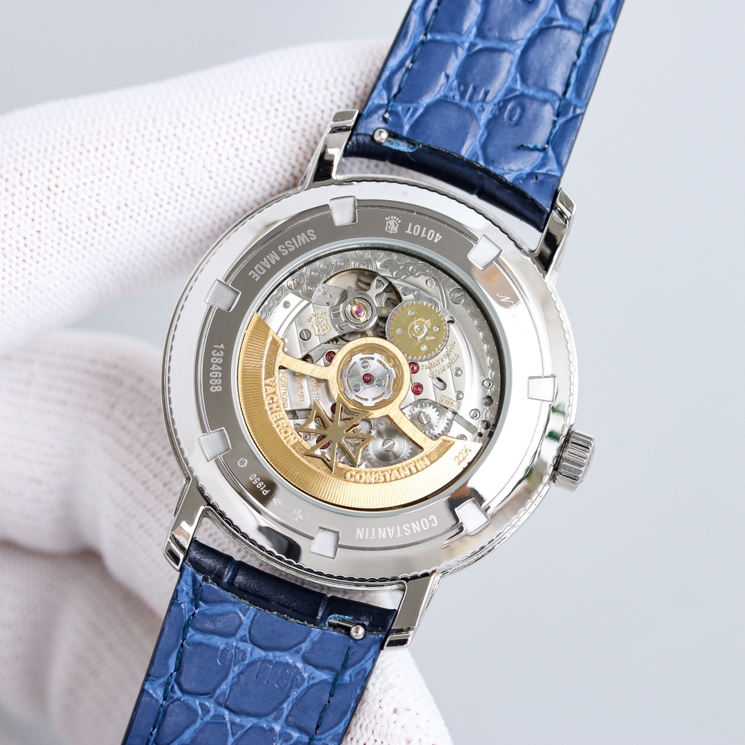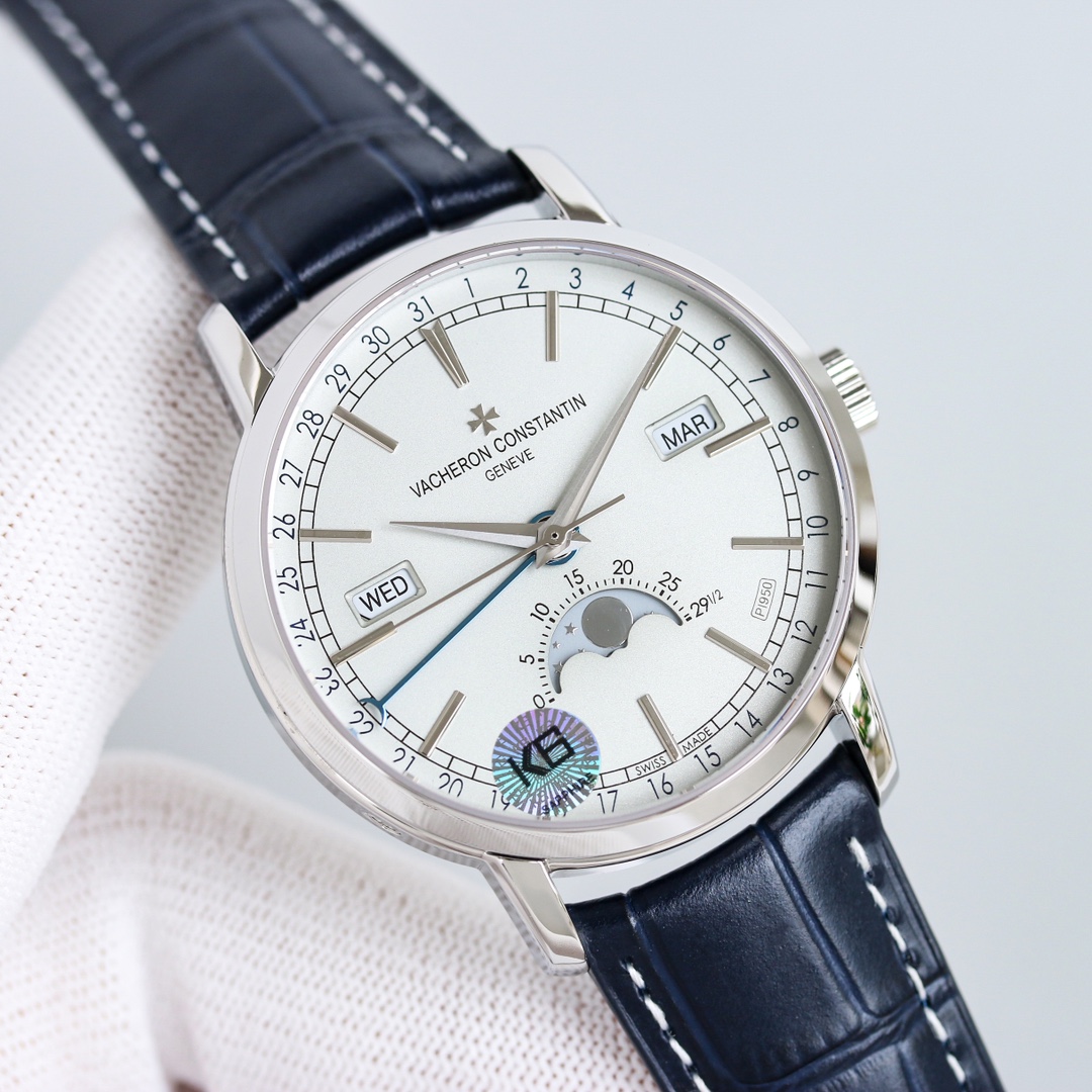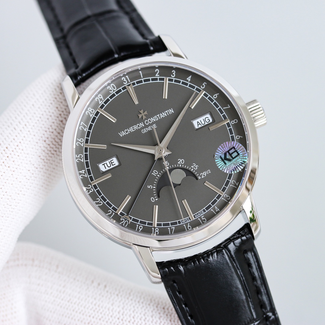 [Dial]: The track-type minute scale and the toffee-style hour and minute hands retain the iconic calendar display created by Vacheron Constantin. The day and month windows are symmetrically distributed on both sides of the dial, and the digital bezel on the outer edge of the dial is a calendar display. It is gently lifted by an elegant black crescent hand for easy reading. The ingenious design breaks the dullness of the dial. This layout clearly shows the precise moon phase display at 6 o'clock. While showing the smart charm, it also shows the unique beauty of complex machinery.