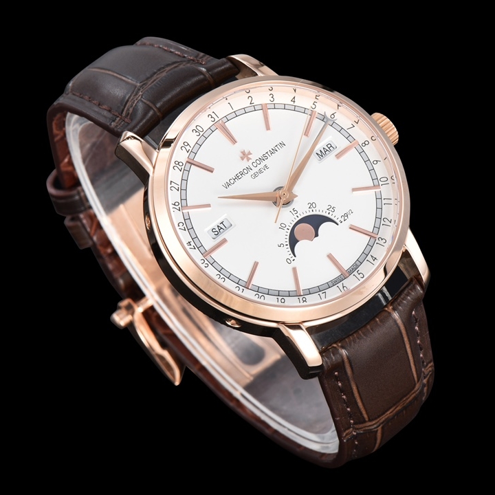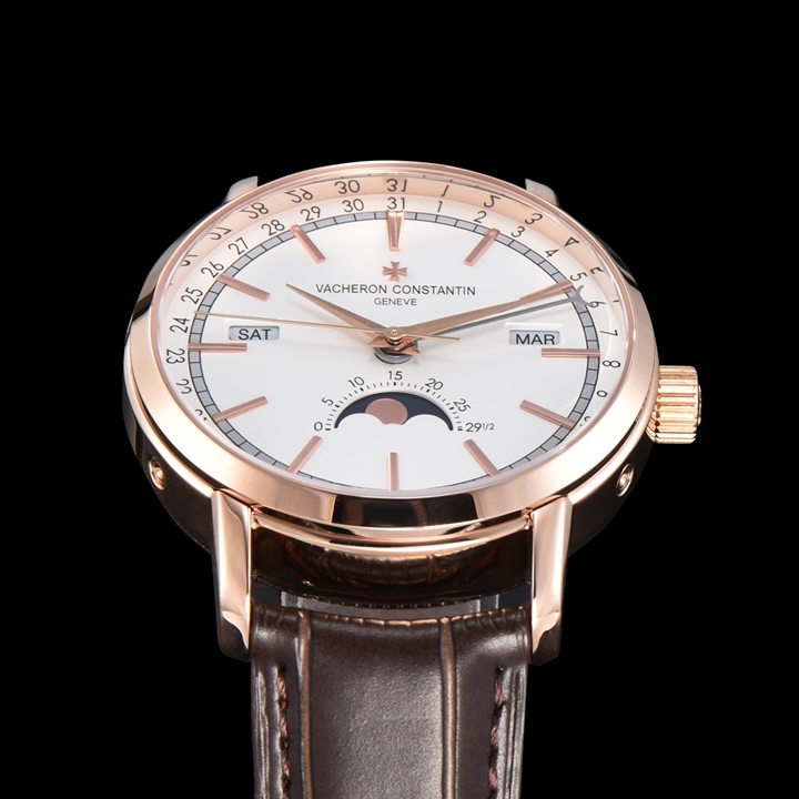 [Dial]: The track-type minute scale and the toffee-style hour and minute hands retain the iconic calendar display created by Vacheron Constantin. The day and month windows are symmetrically distributed on both sides of the dial, and the digital bezel on the outer edge of the dial is a calendar display. It is gently lifted by an elegant black crescent hand for easy reading. The ingenious design breaks the dullness of the dial. This layout clearly shows the precise moon phase display at 6 o'clock. While showing the smart charm, it also shows the unique beauty of complex machinery.